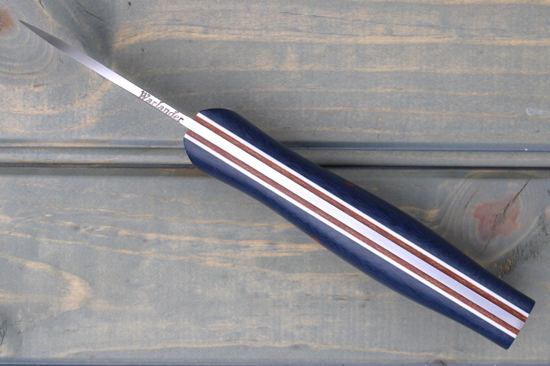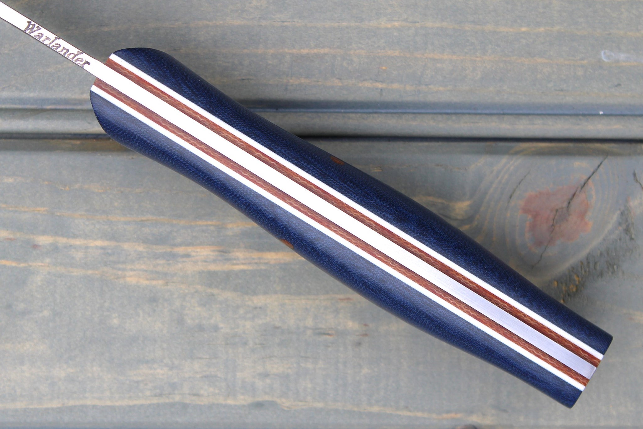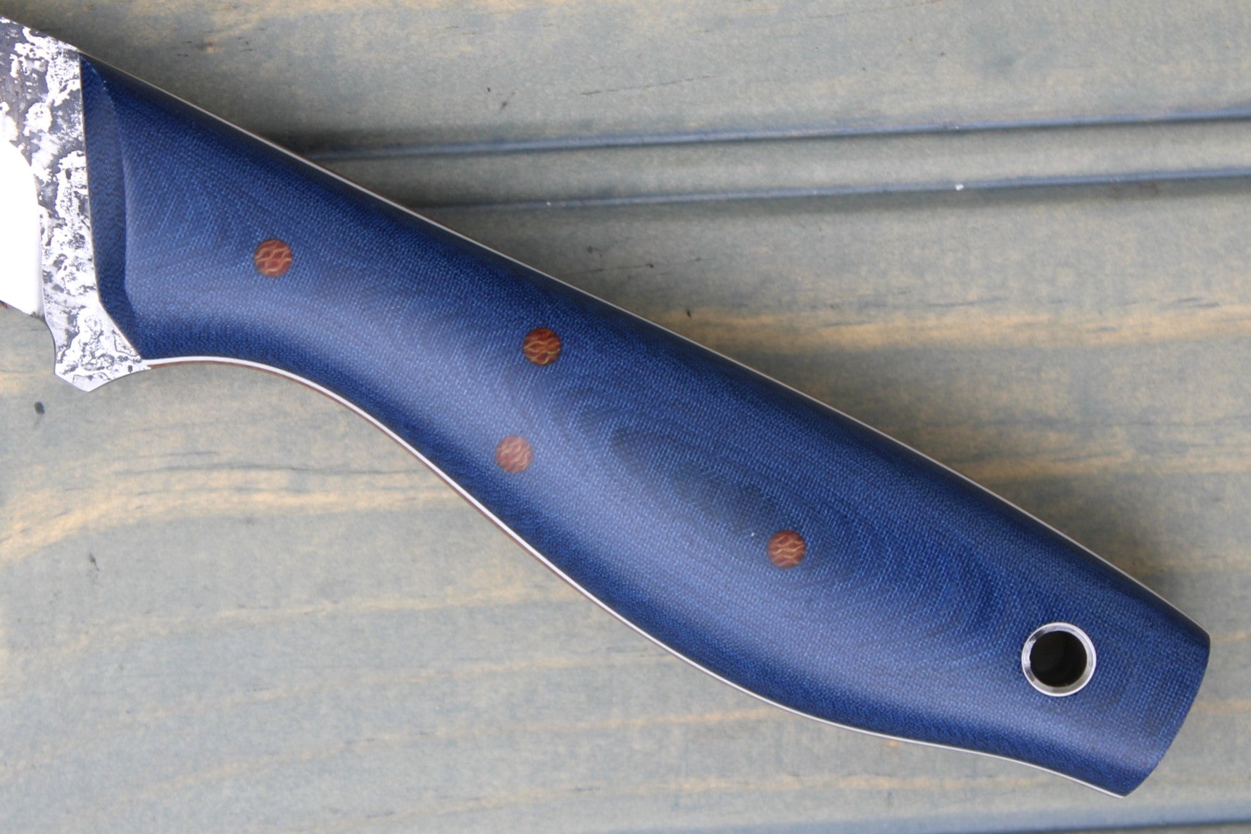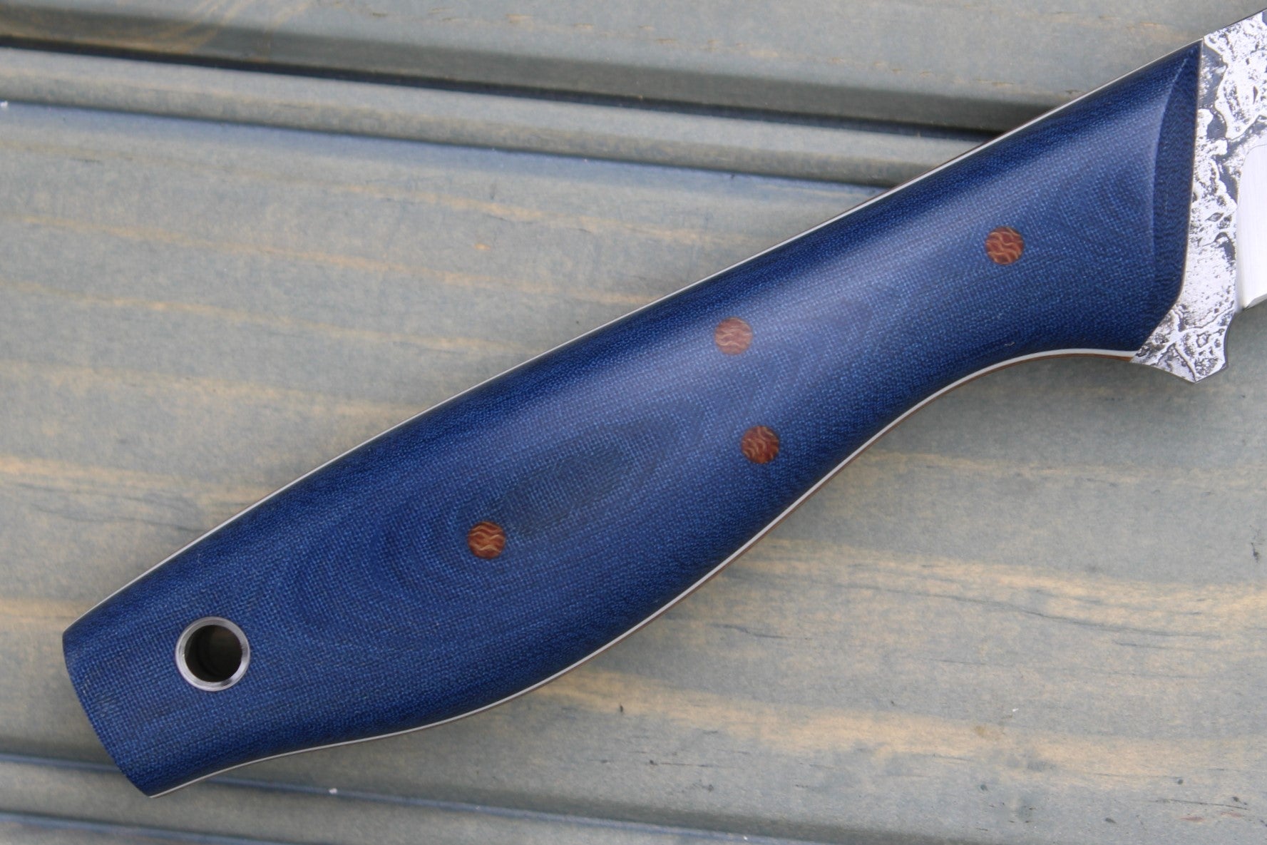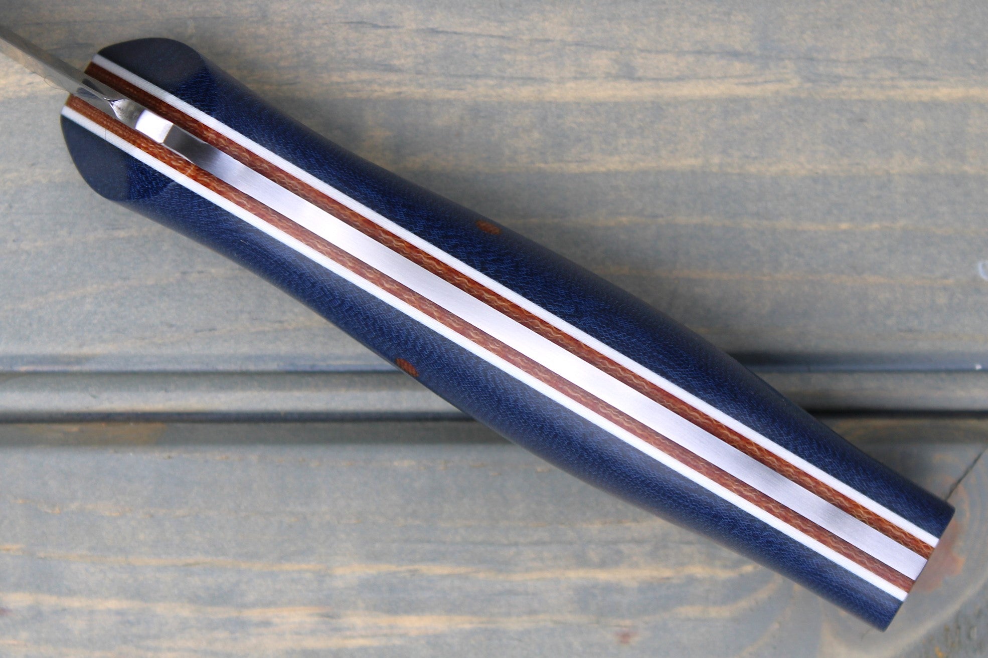 Handle: Blue Linen Micarta, Natural Canvas Micarta Liner, White G10 Pinstripe, Micarta Pins