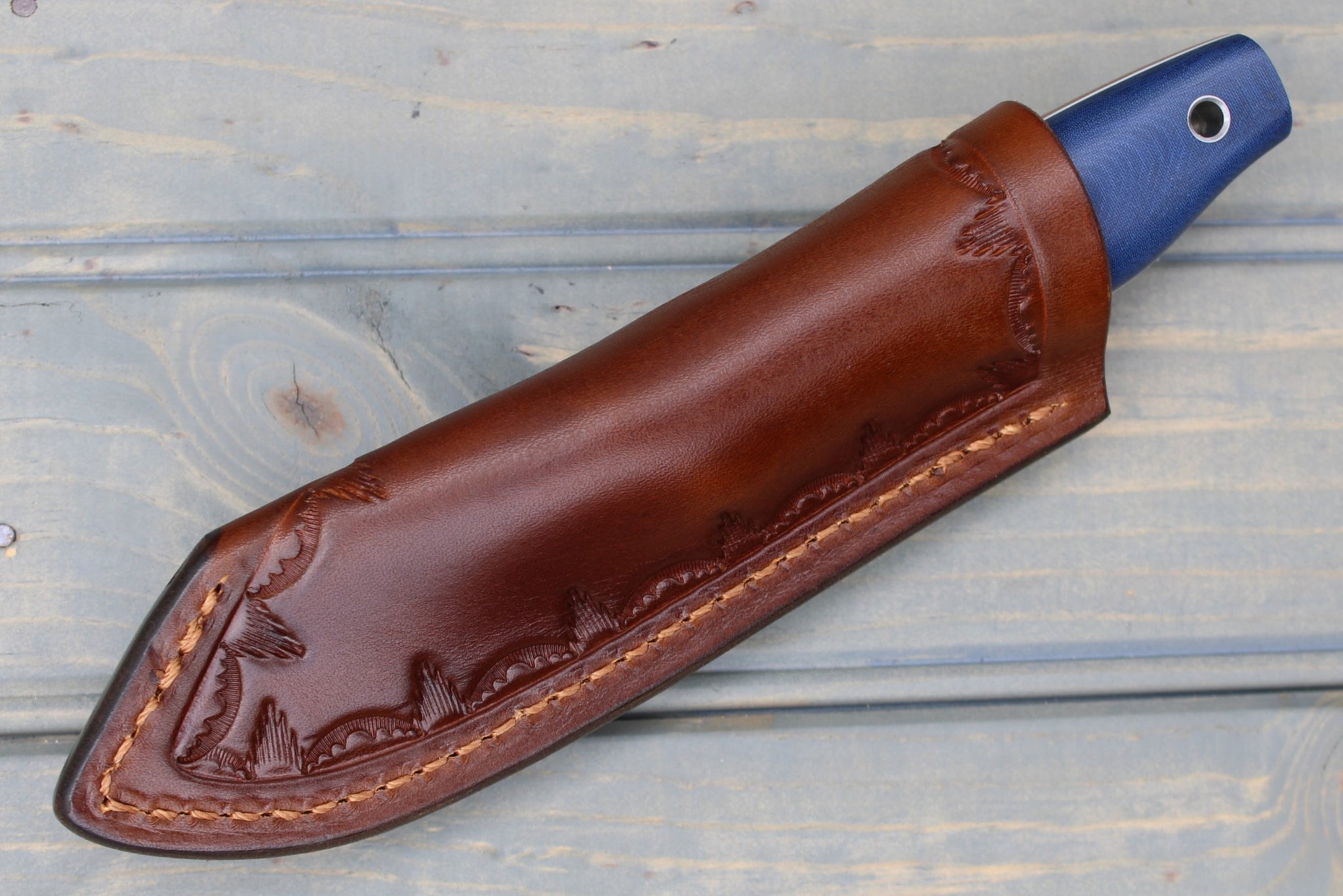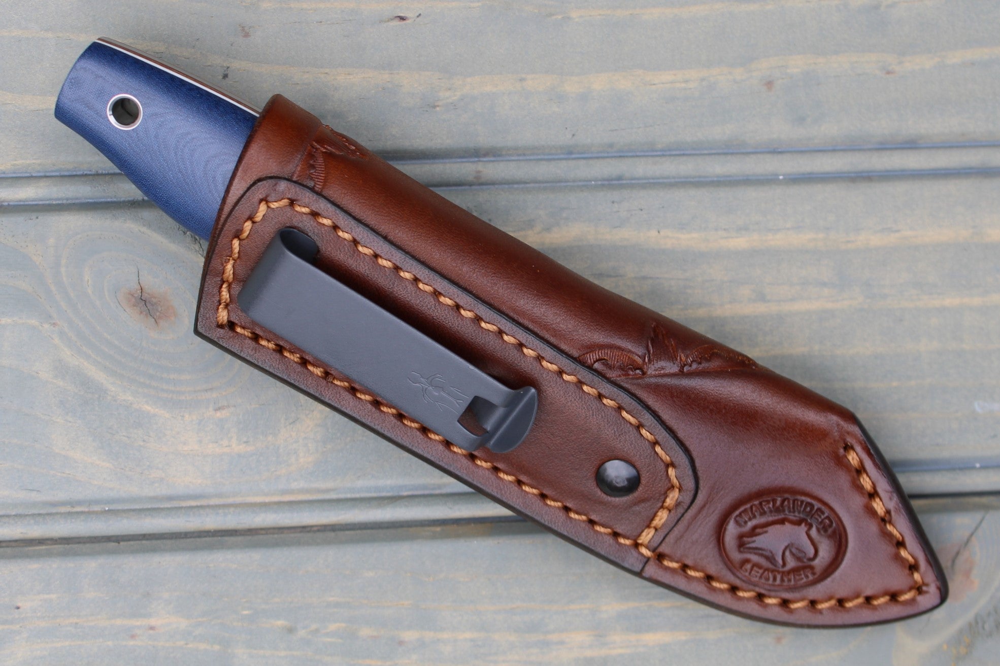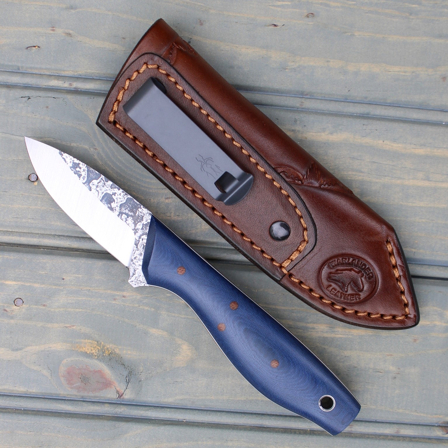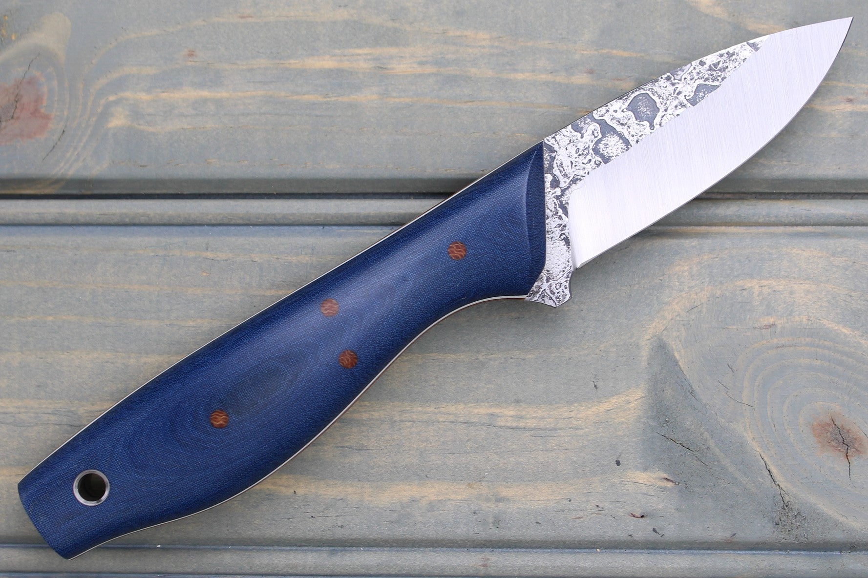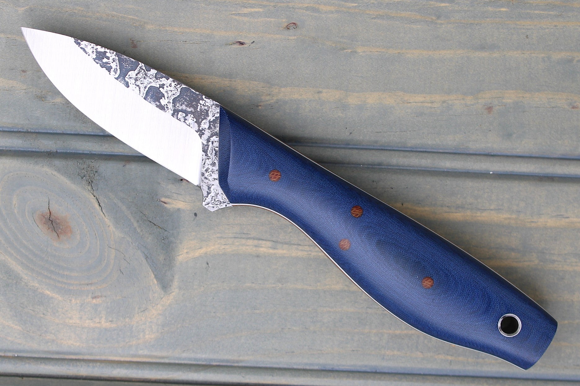 Handle: Blue Linen Micarta, Natural Canvas Micarta Liner, White G10 Pinstripe, Micarta Pins