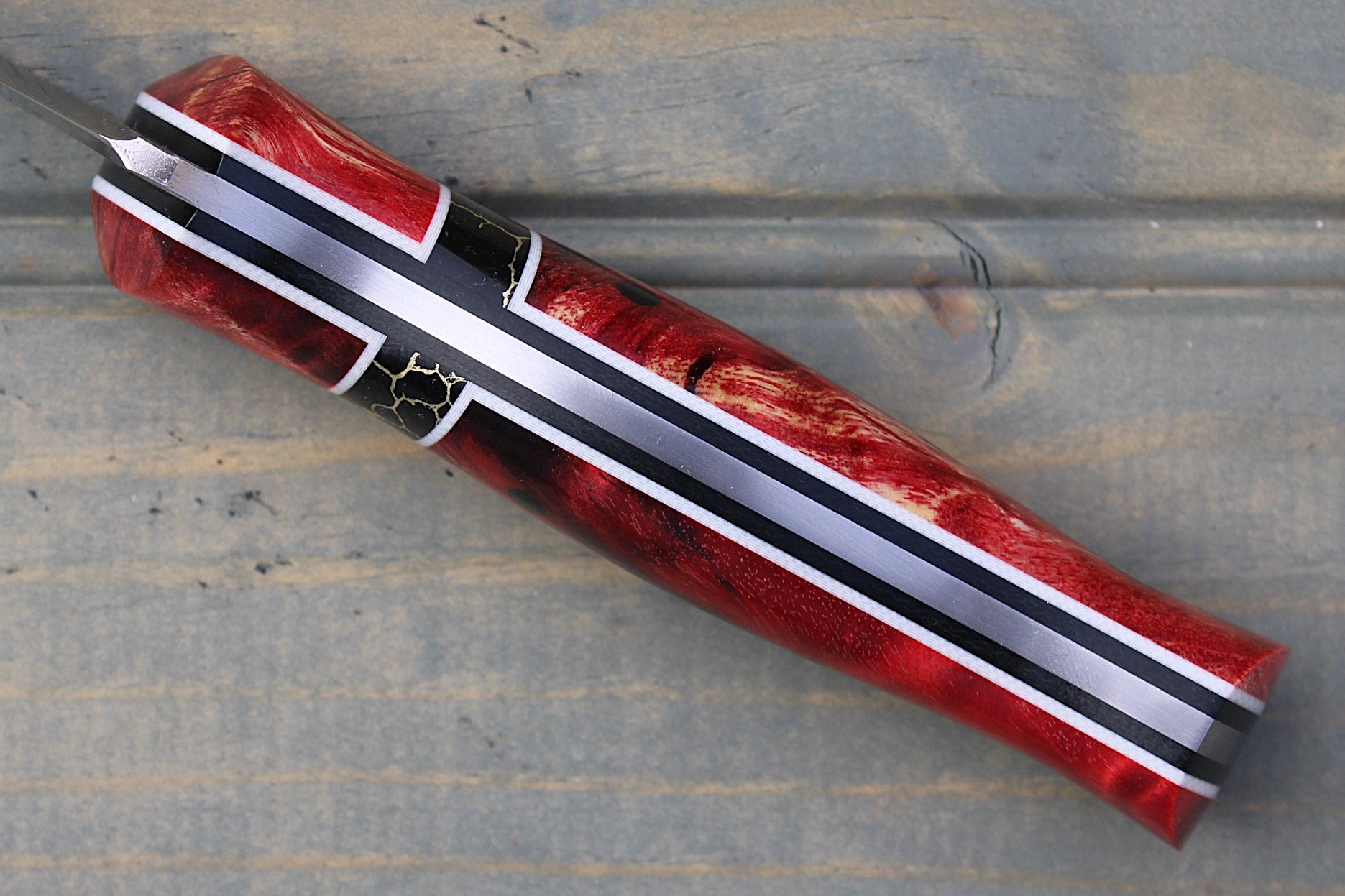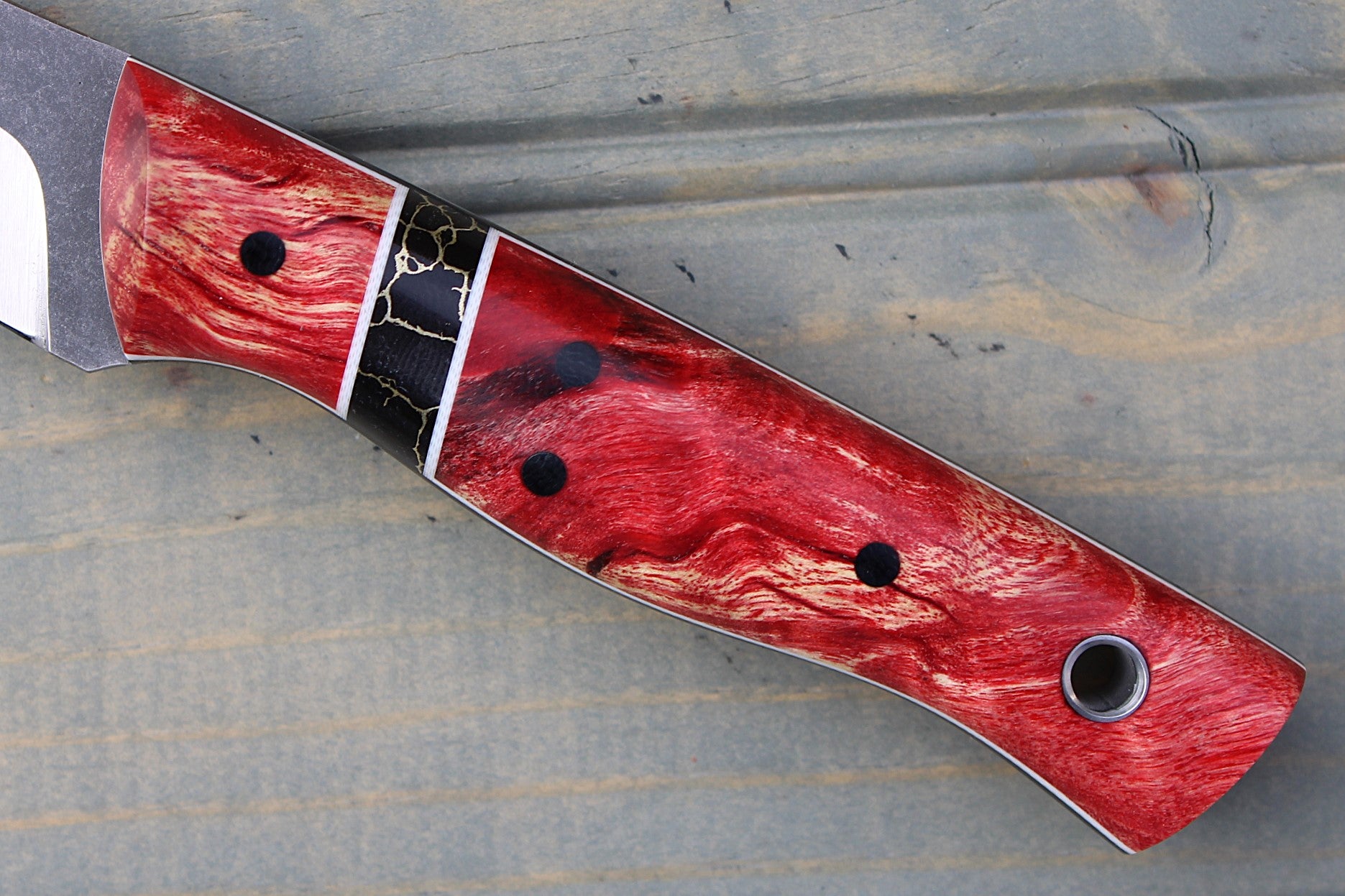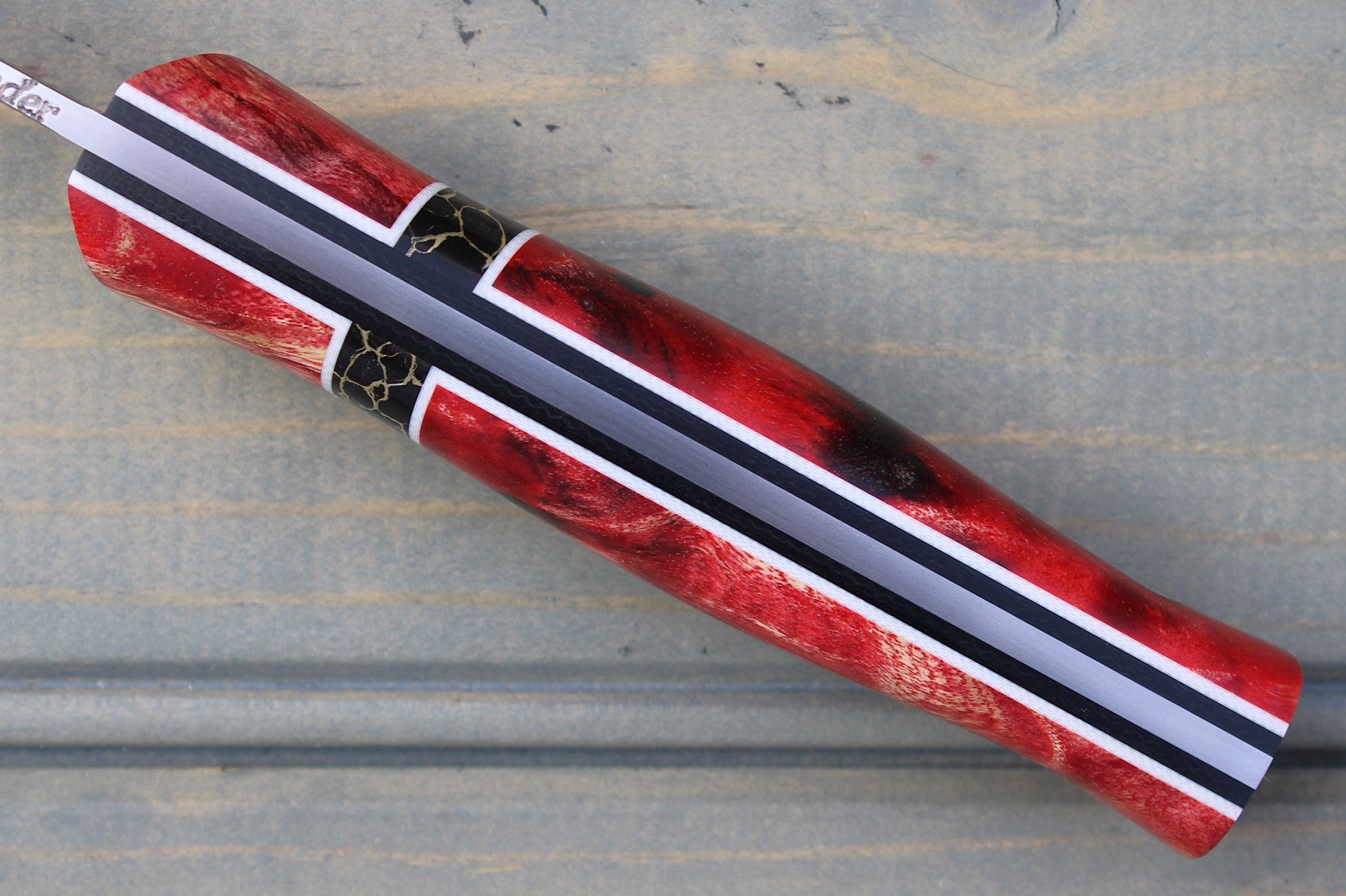 Handle: Split Fiery Cottonwood, Black/Gold Silestone Spacer, Black Canvas Micarta Liner, White G10 Pinstripe Micarta Pins