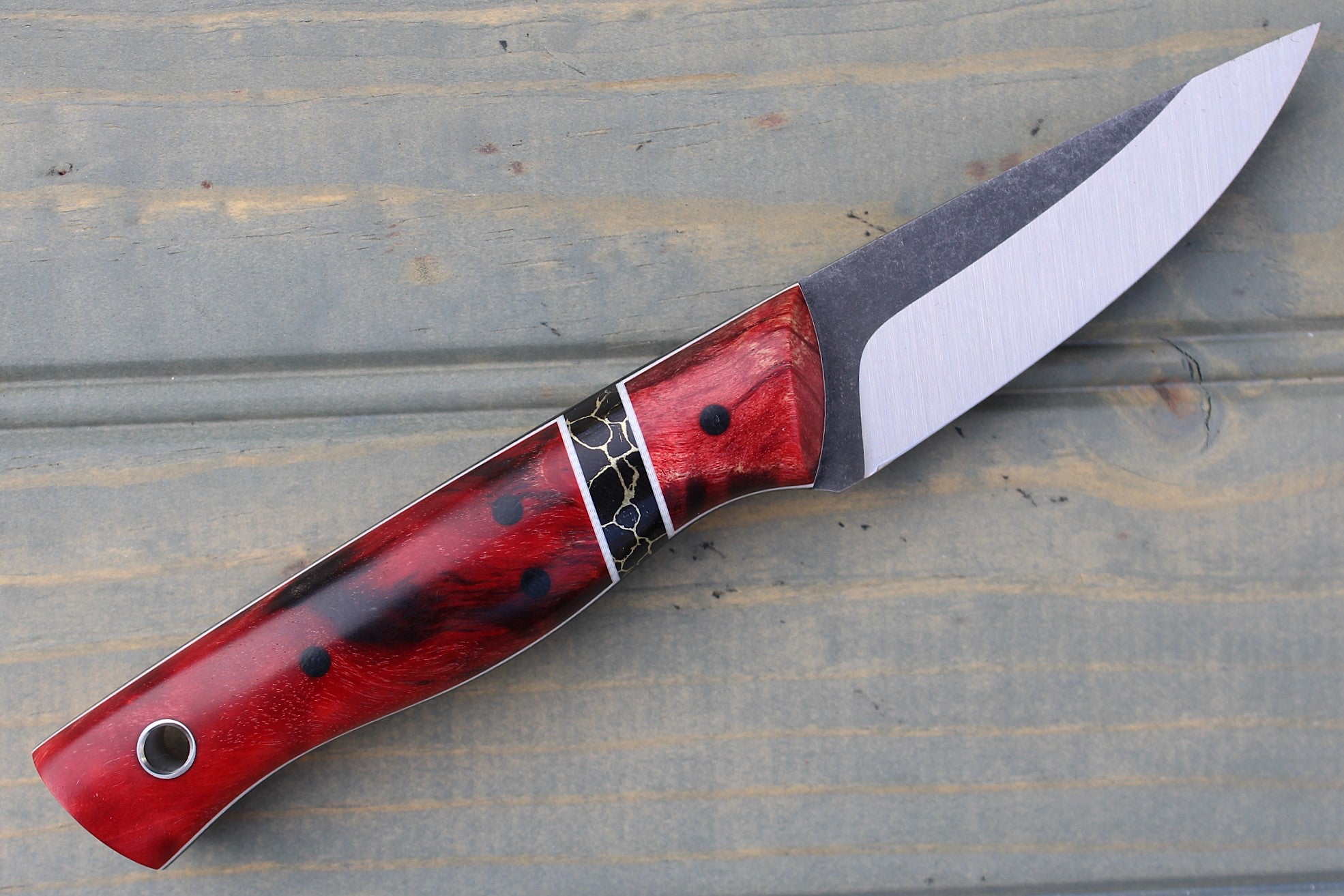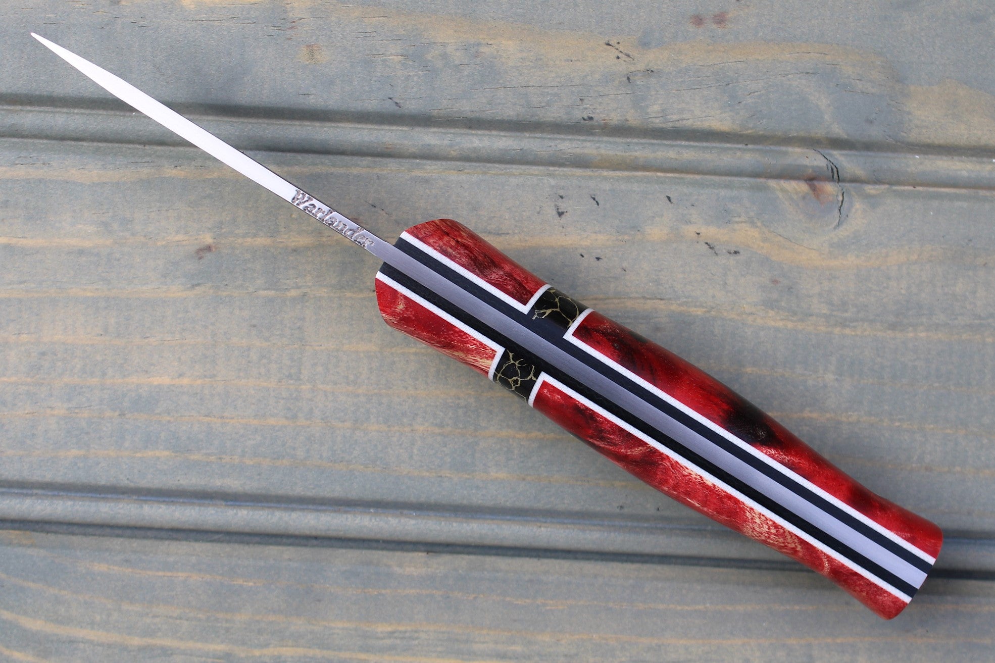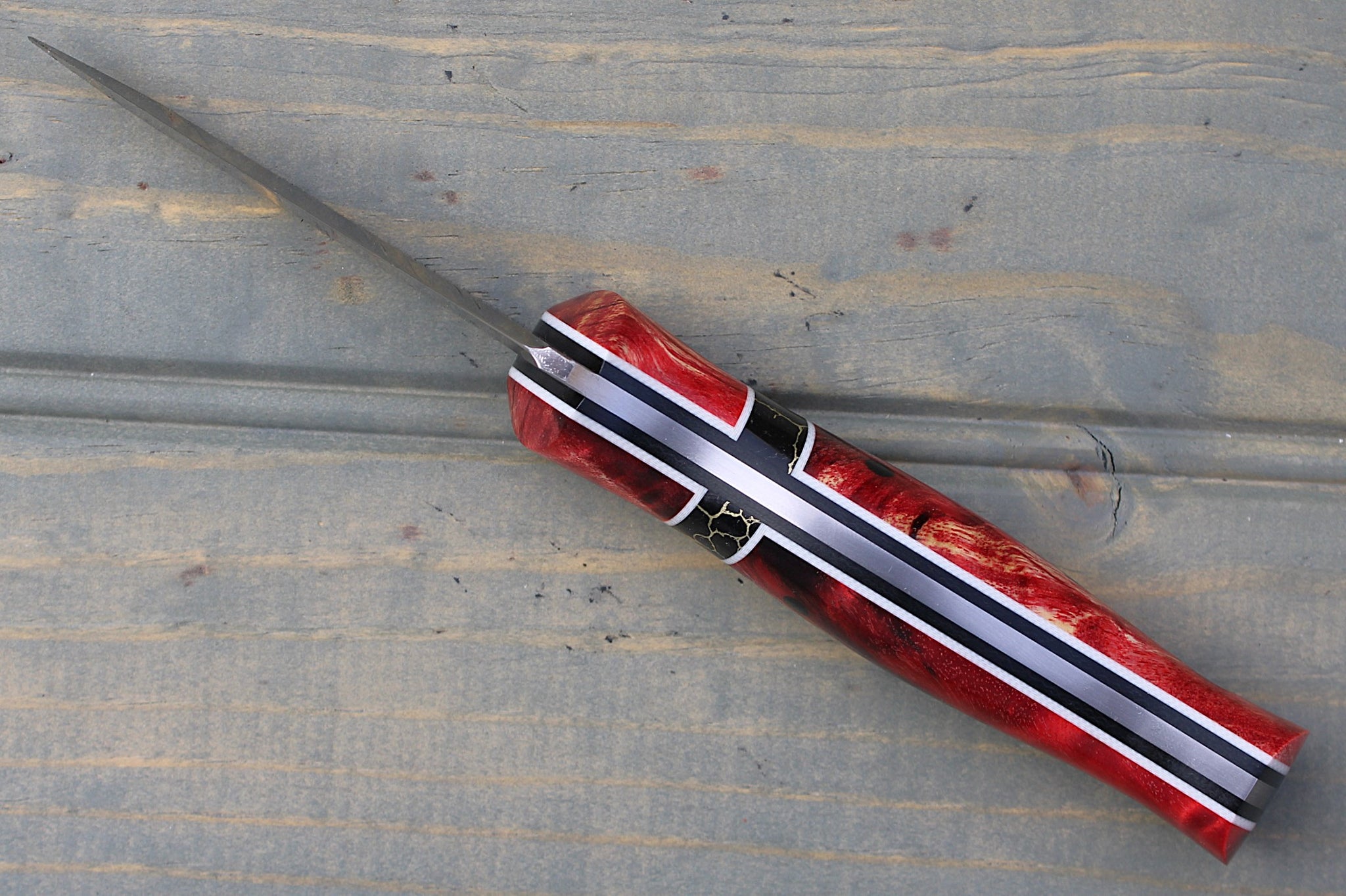 Handle: Split Fiery Cottonwood, Black/Gold Silestone Spacer, Black Canvas Micarta Liner, White G10 Pinstripe Micarta Pins