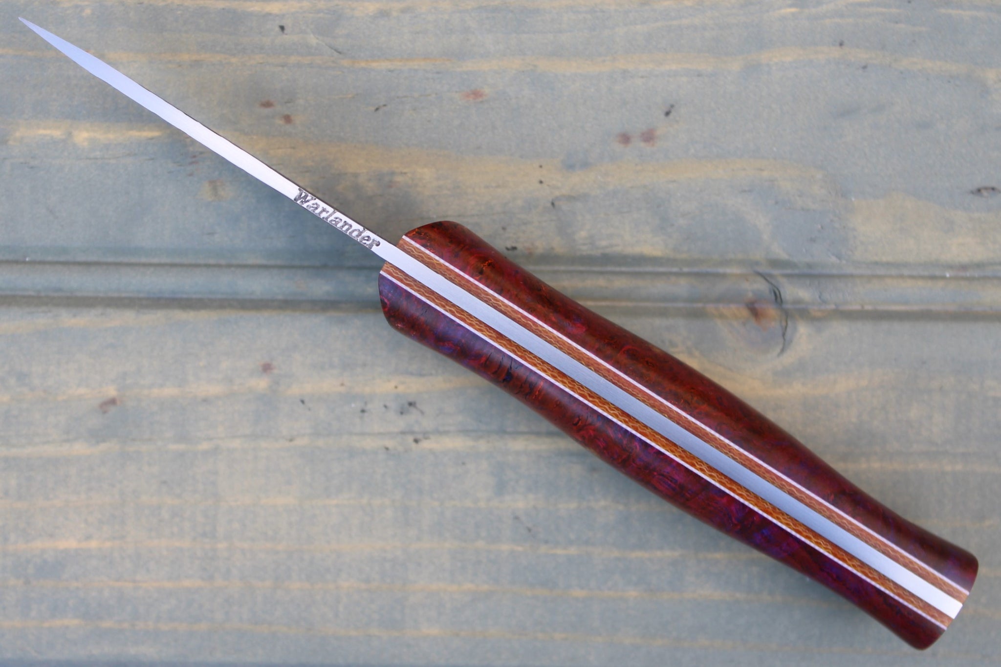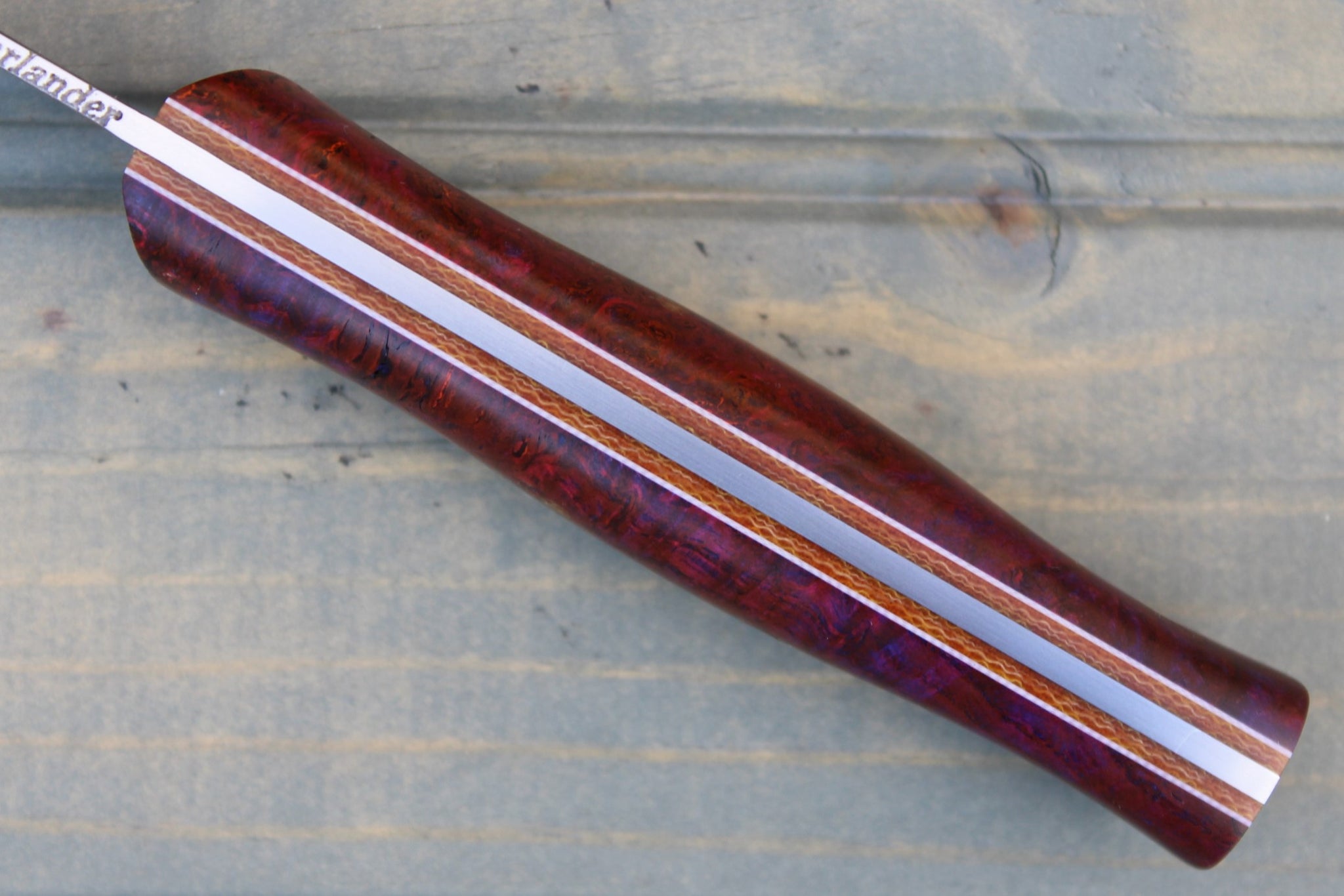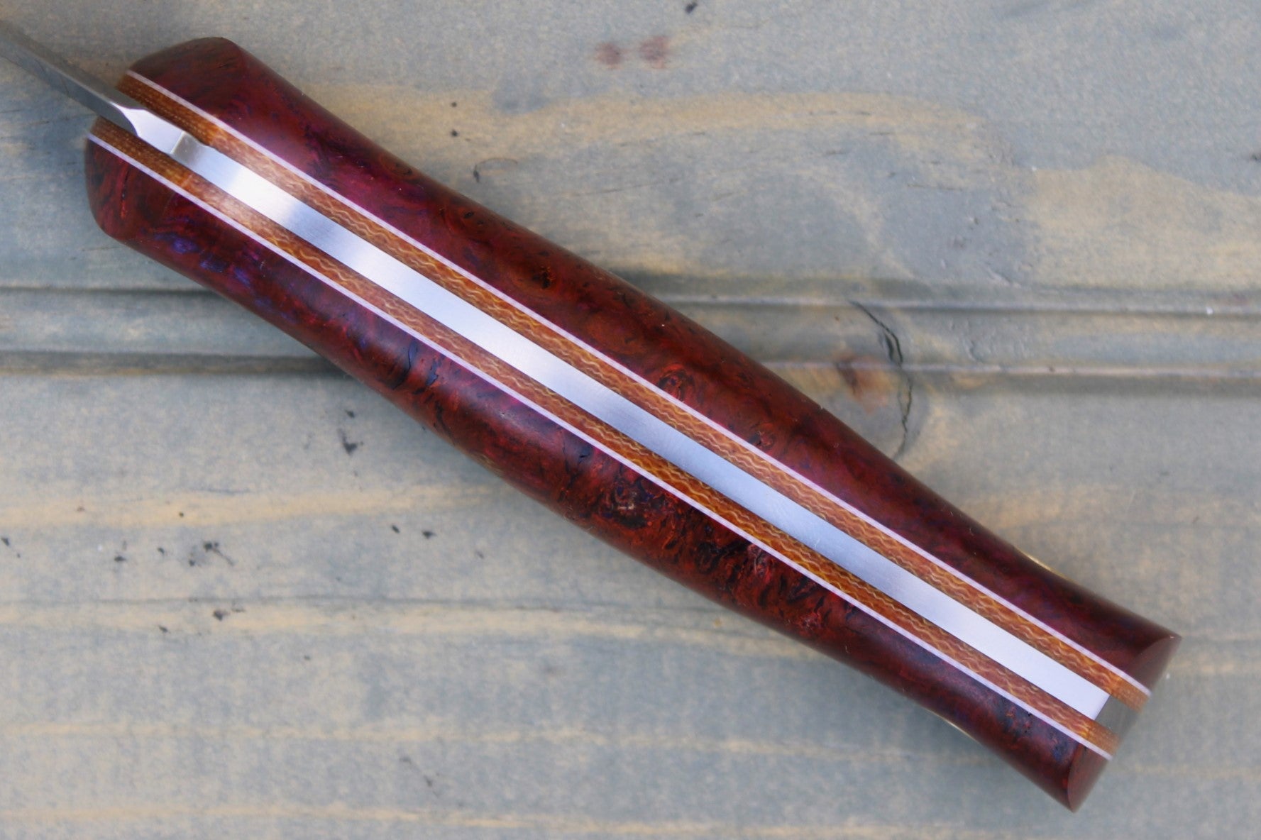 Handle: Dyed Stabilized Black Ash Burl, Natural Canvas Micarta Liner, Thin White G10 Pinstripe, Micarta Pins