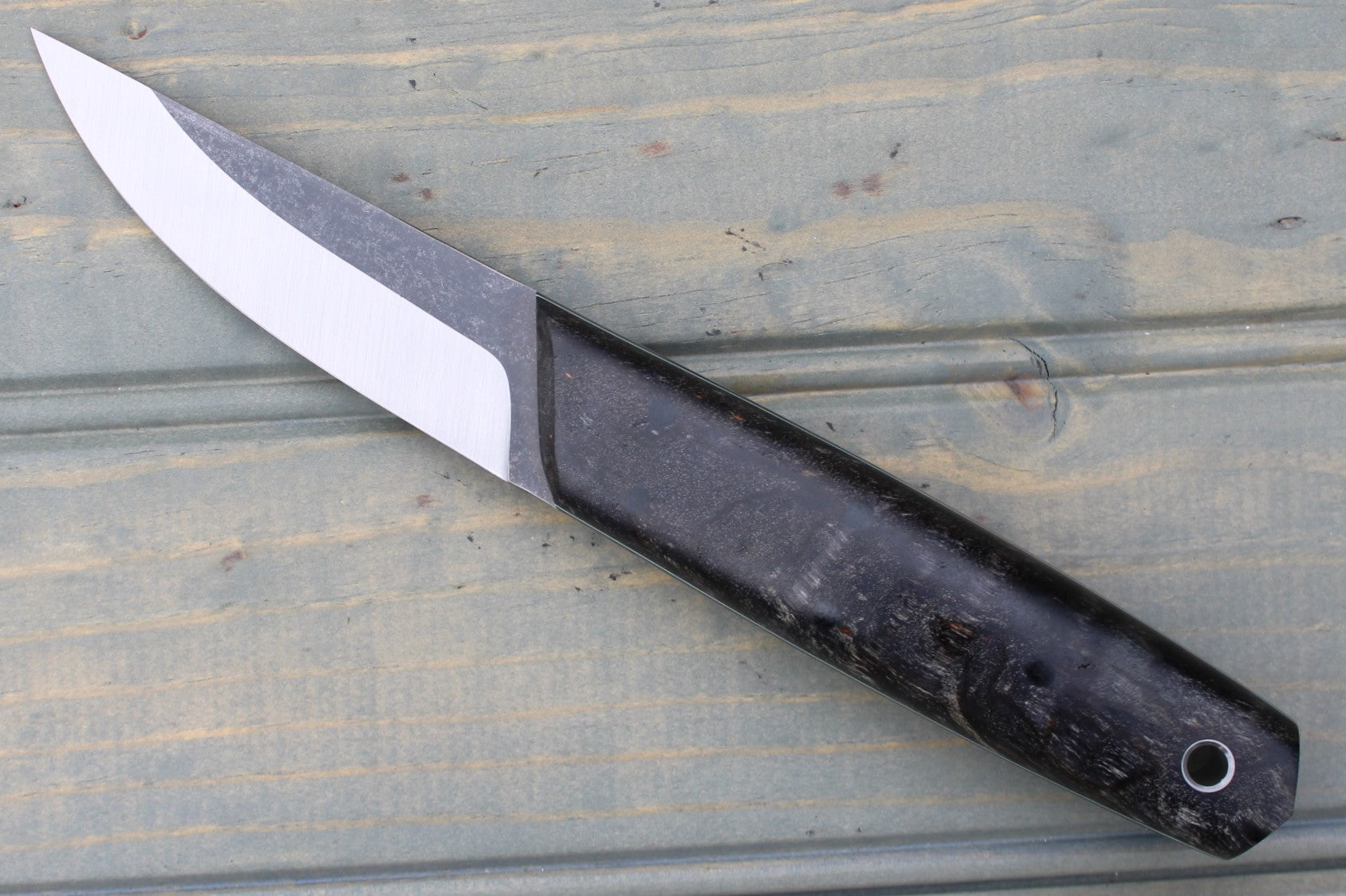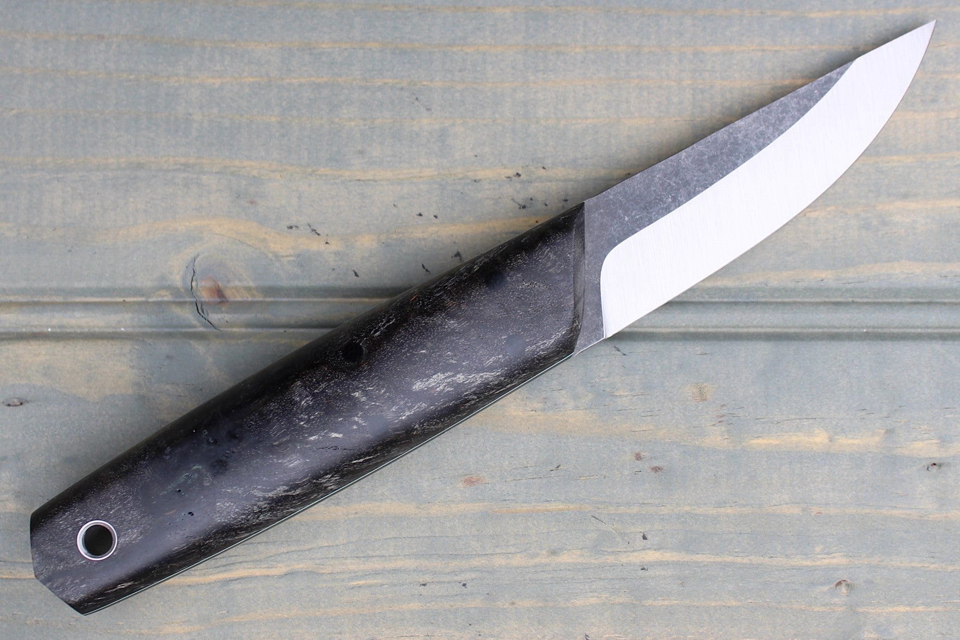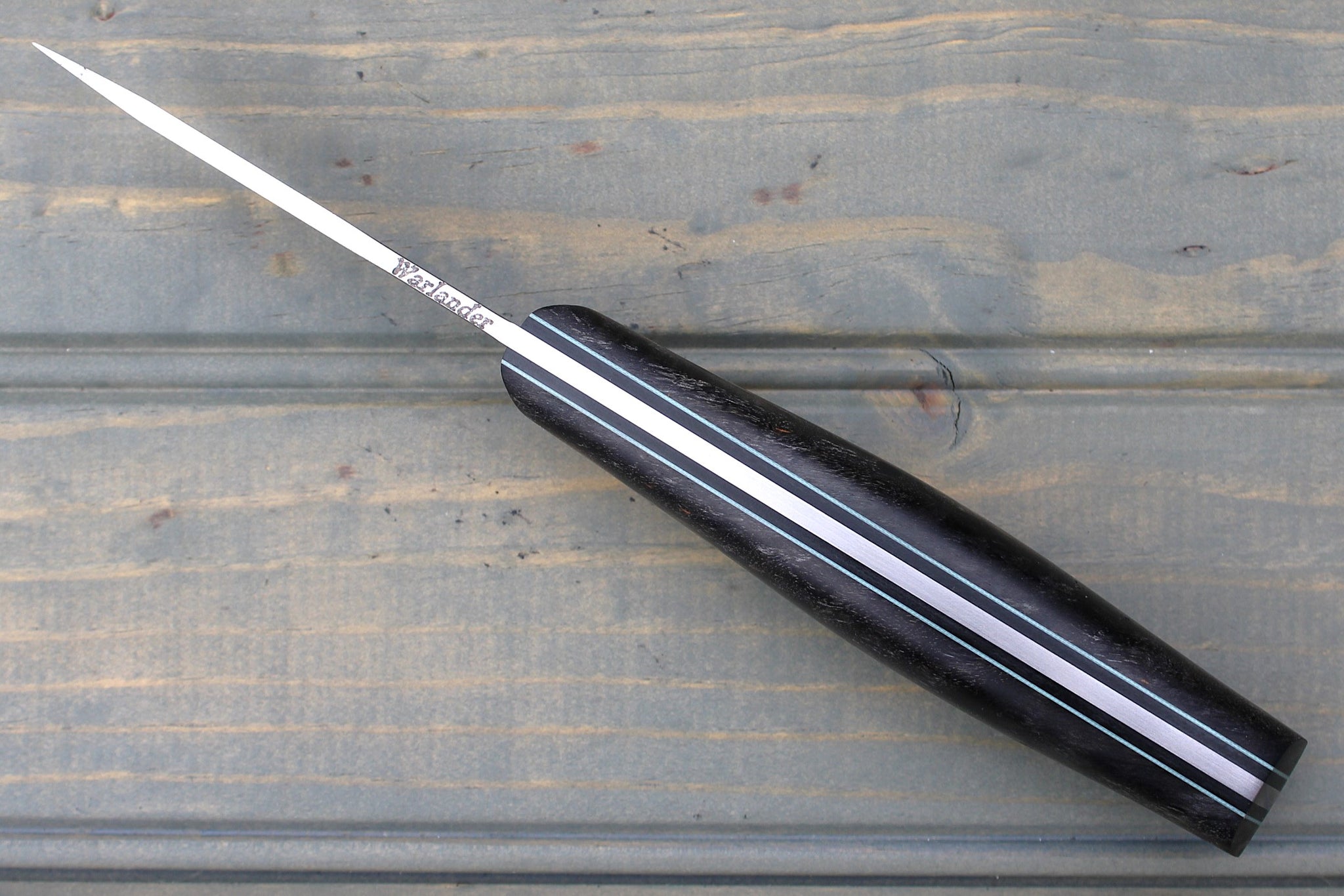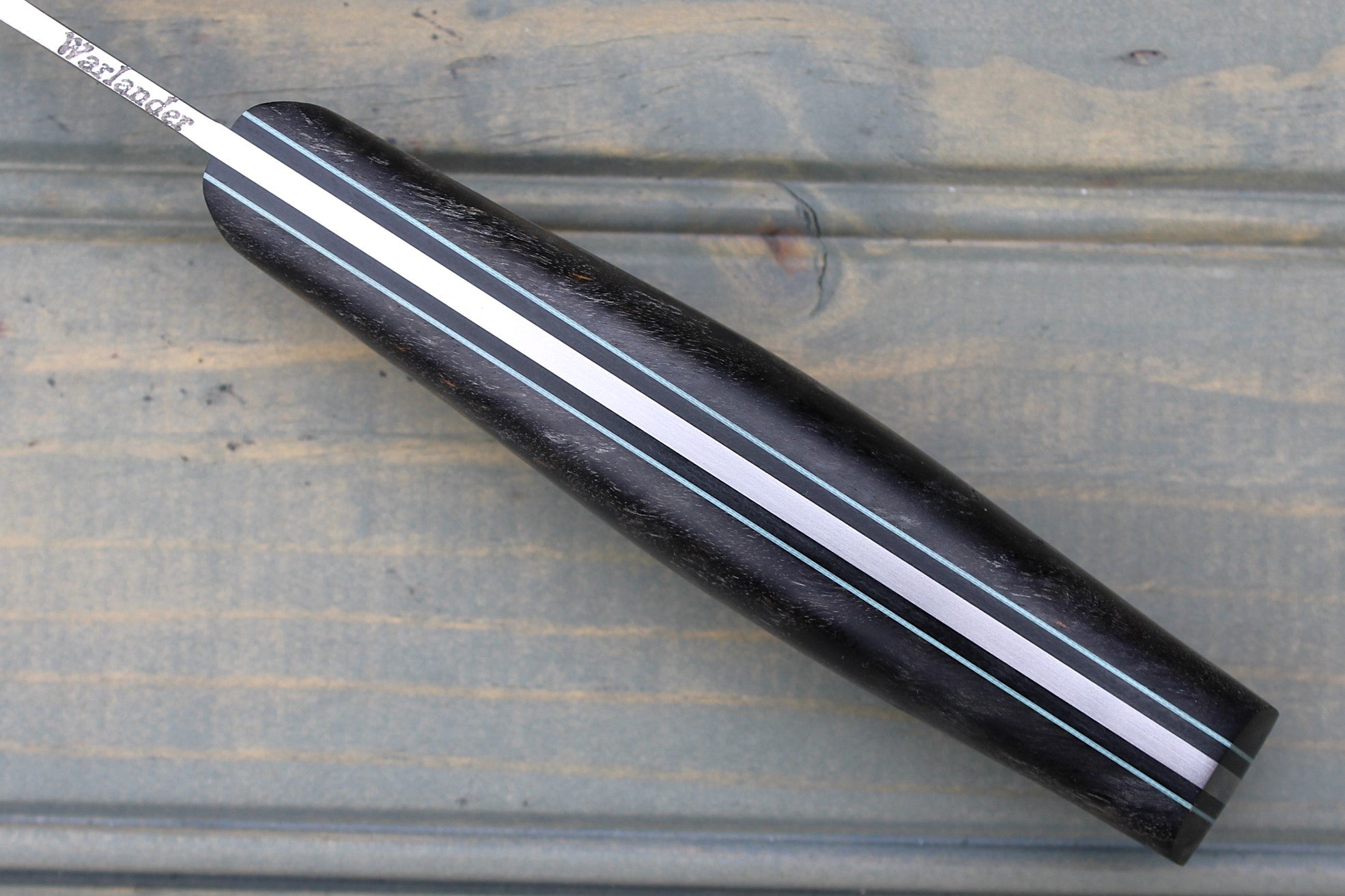 Handle: Stabilized Spalted Charcoal Maple, Black Canvas Micarta Pins, Thin Light Blue G10 Pinstripe, Micarta Pins