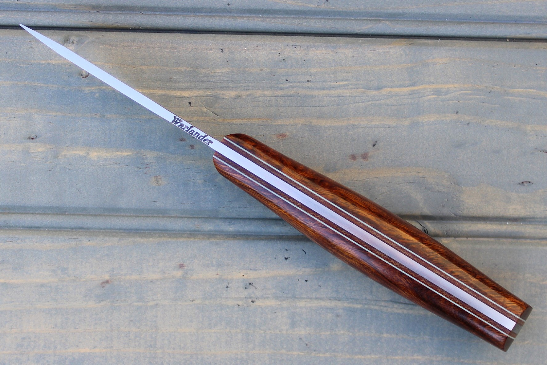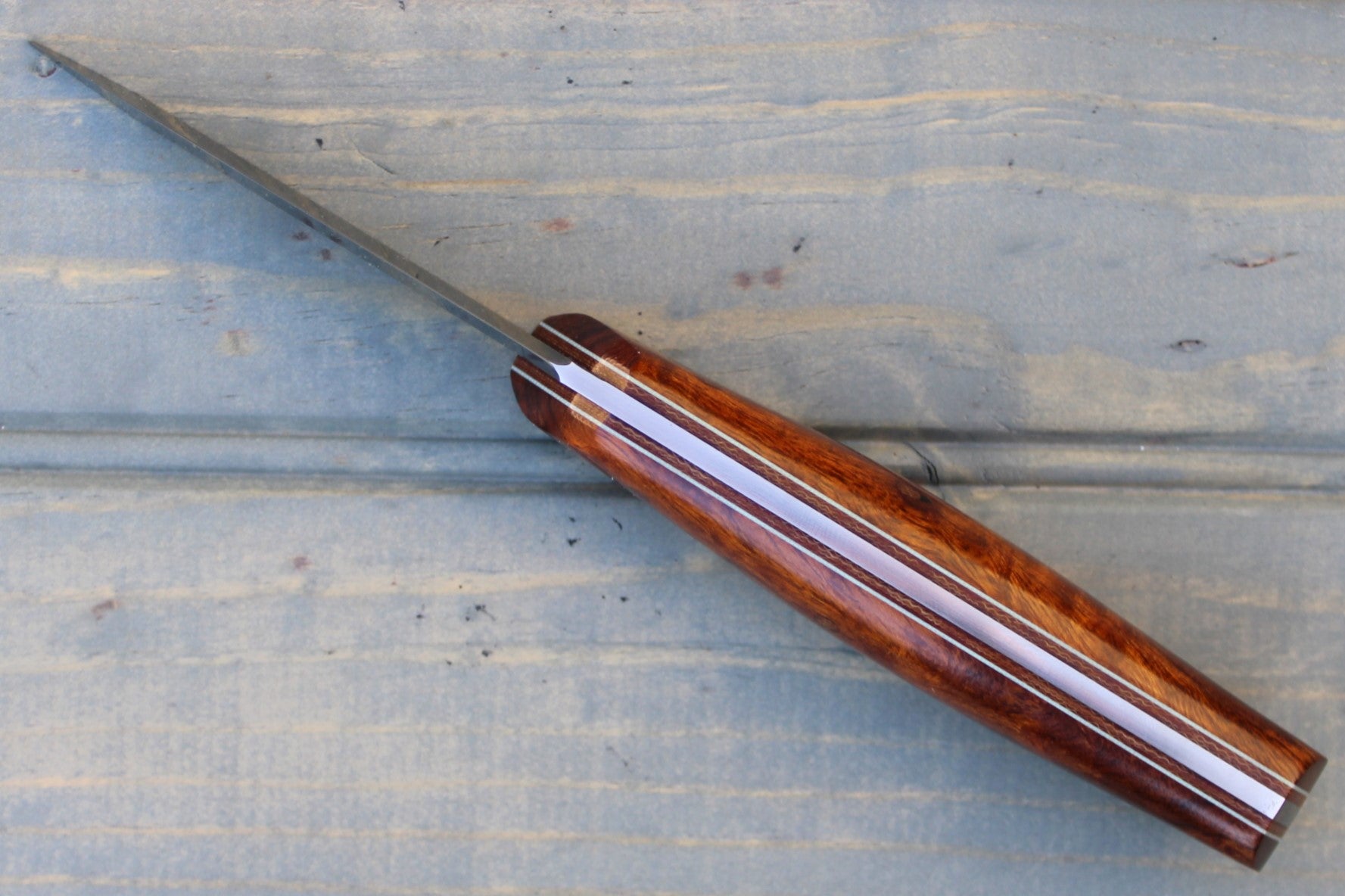 Handle: Desert Ironwood, Natural Canvas Micarta Liner, Thin Light Blue G10 Pinstripe, Micarta Pins