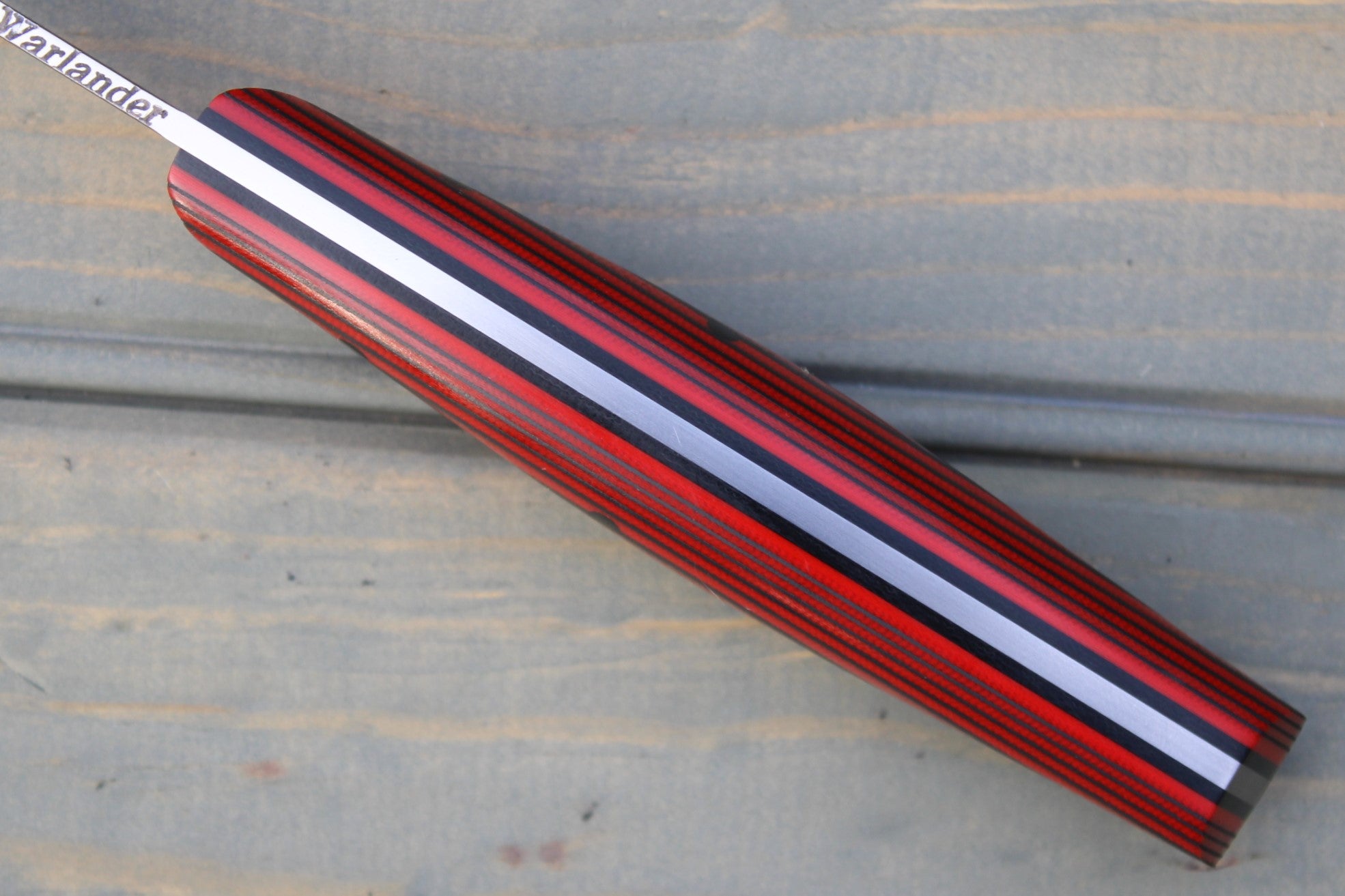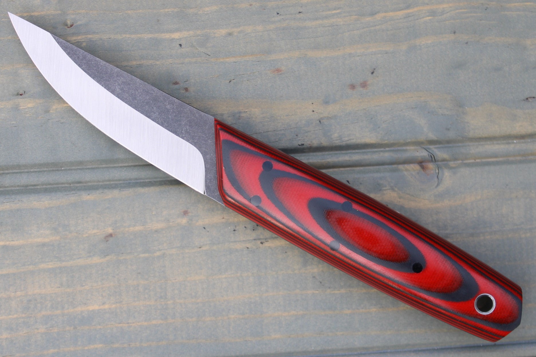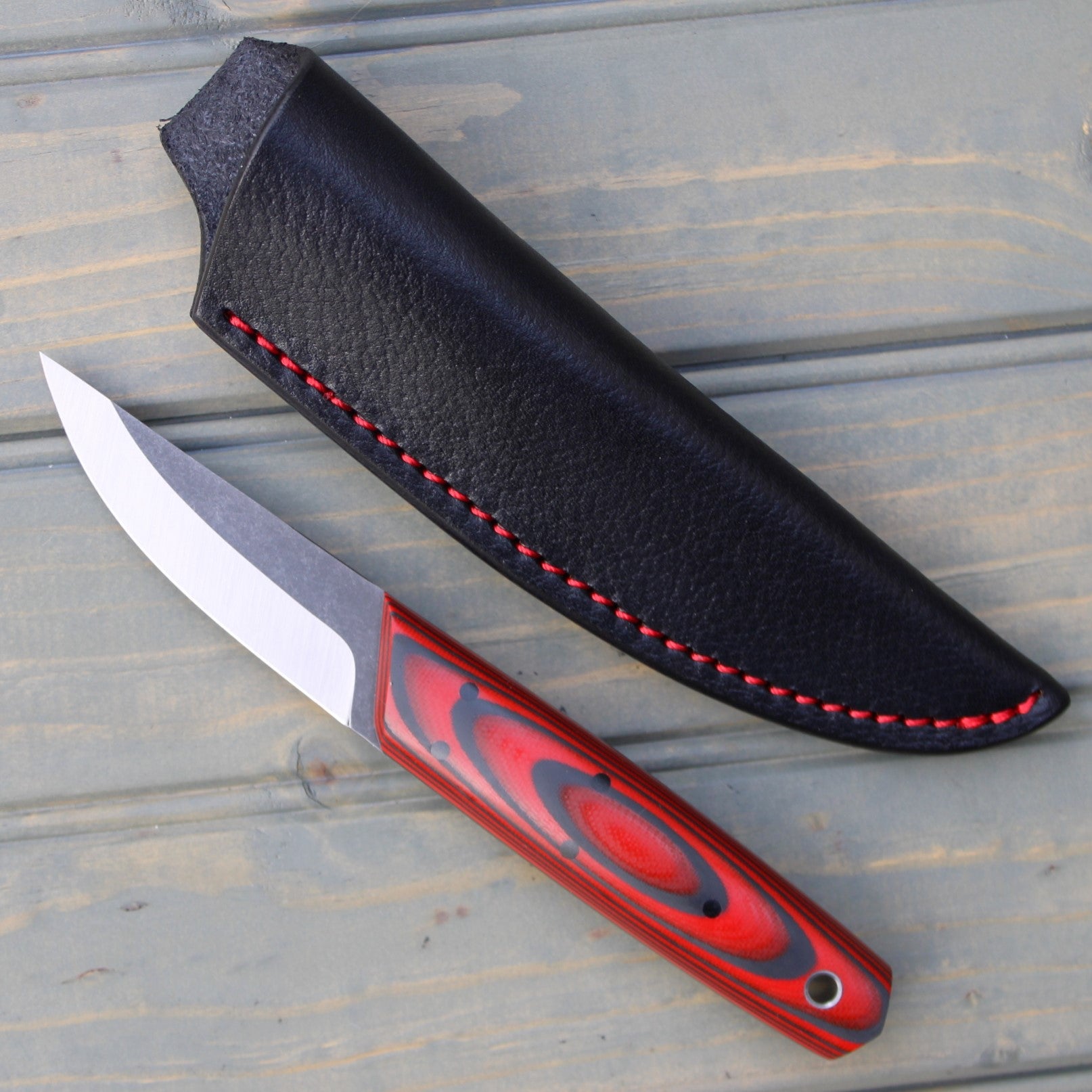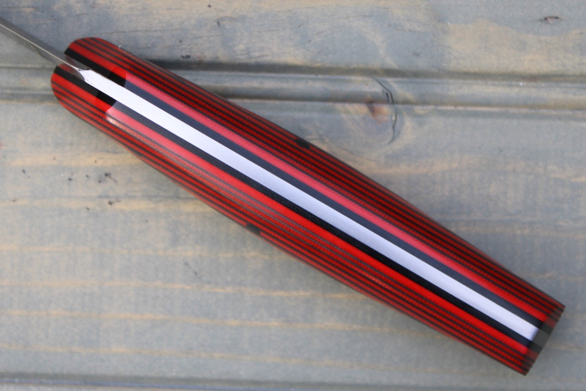 Handle: Red/Black AmeraGrip (G10/Nitrile Rubber), Black Micarta Liner, Red G10 Pinstripe, Black Micarta Pins