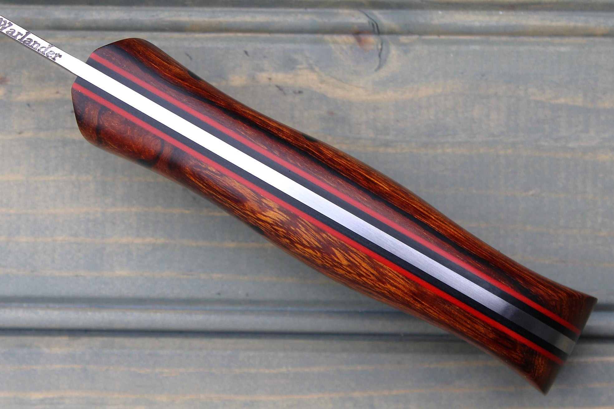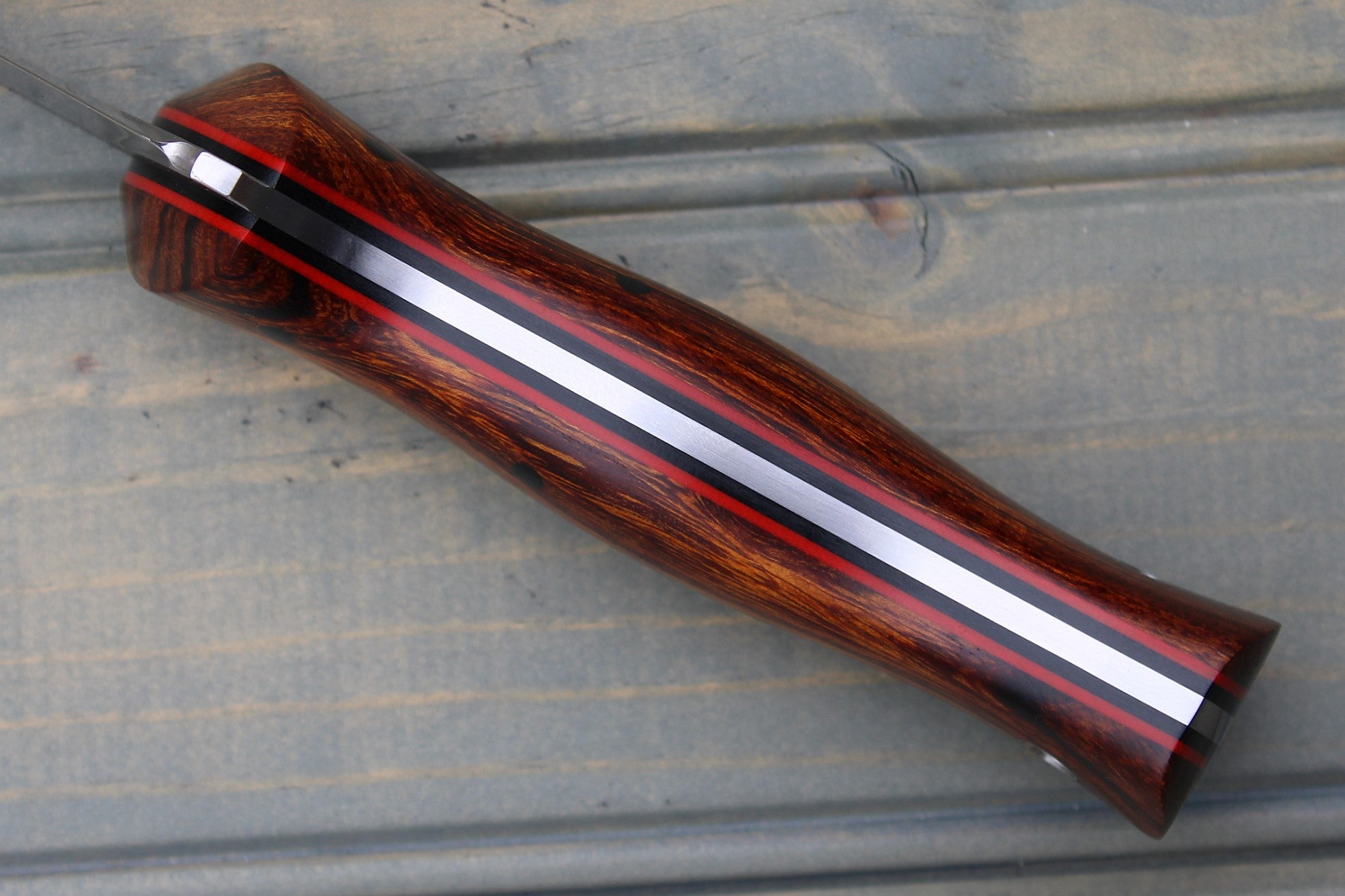 Handle: Desert Ironwood, Black Canvas Micarta Liner, Red G10 Pinstripe, Micarta Pins