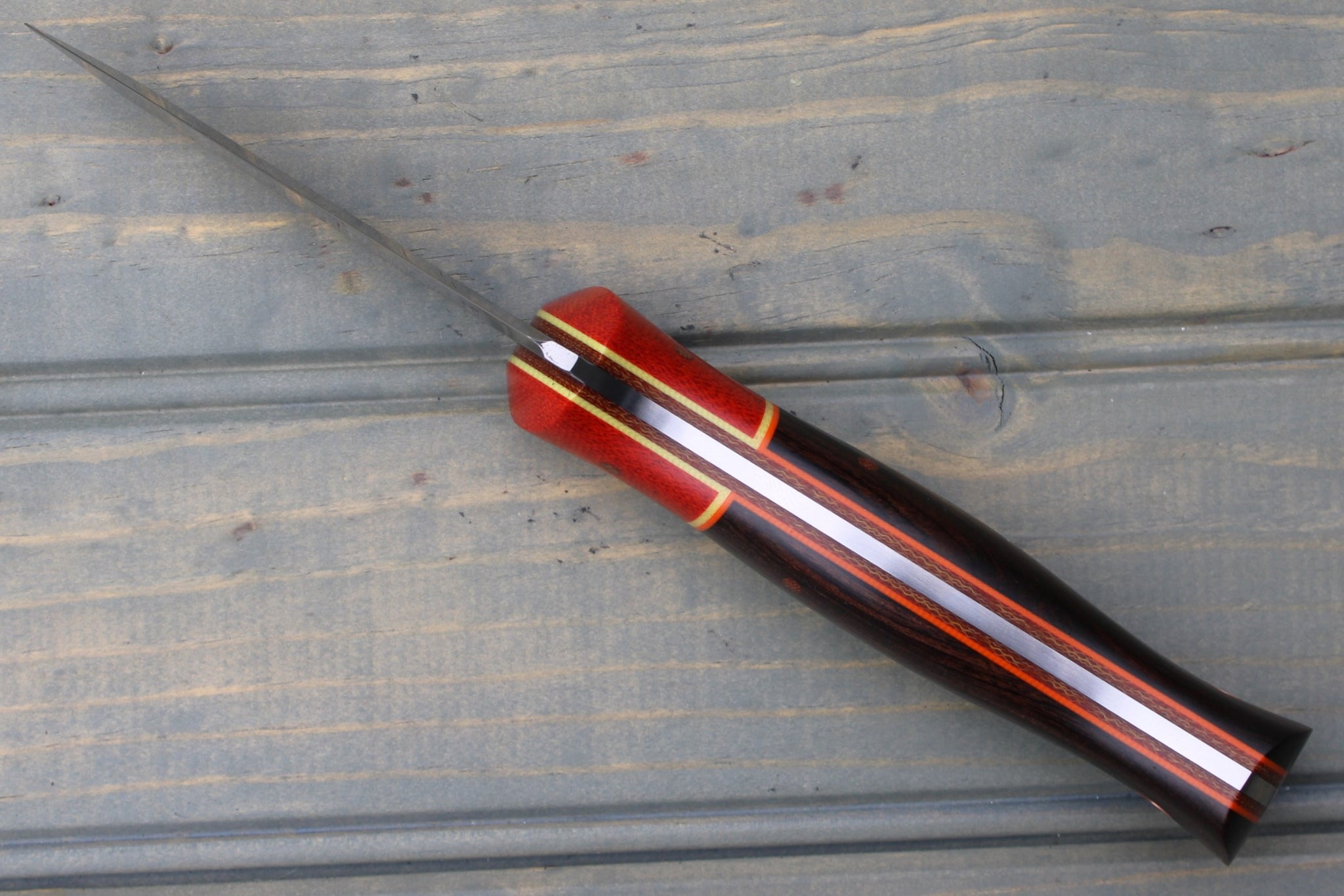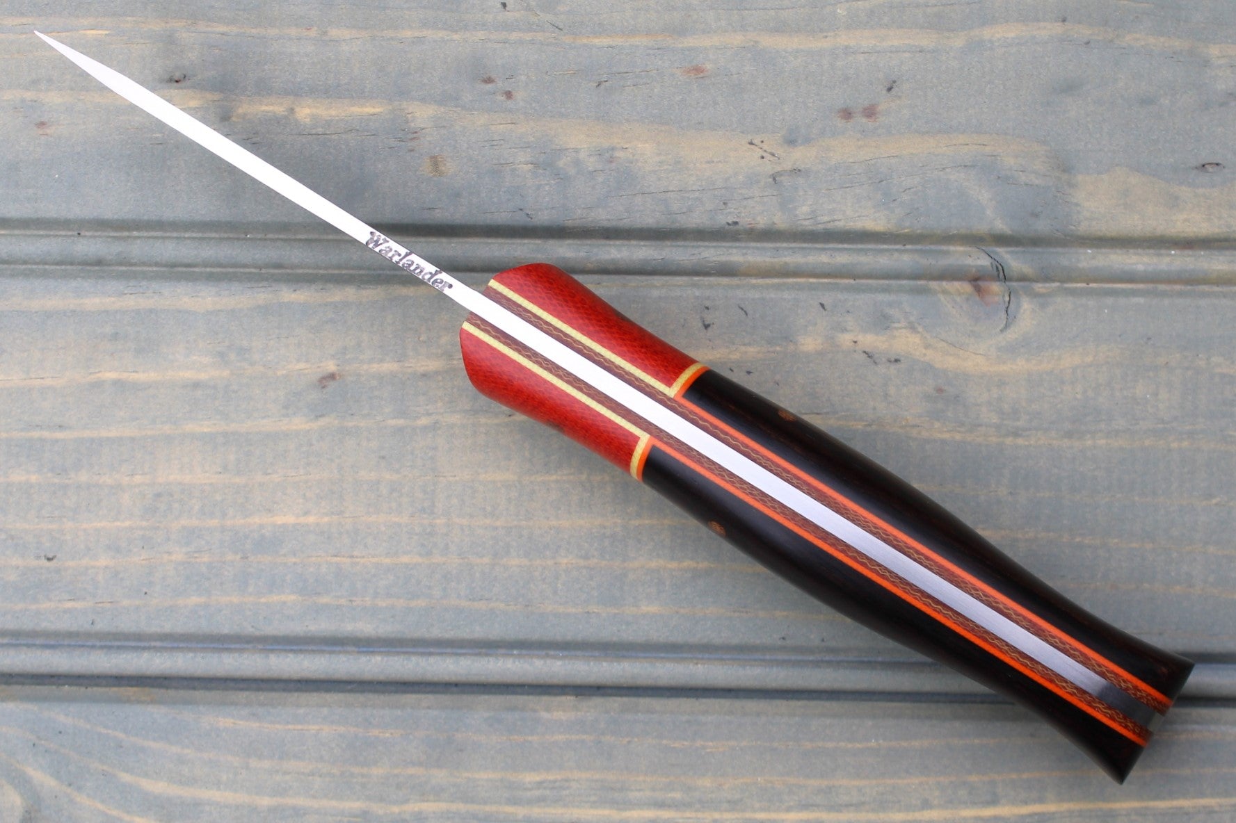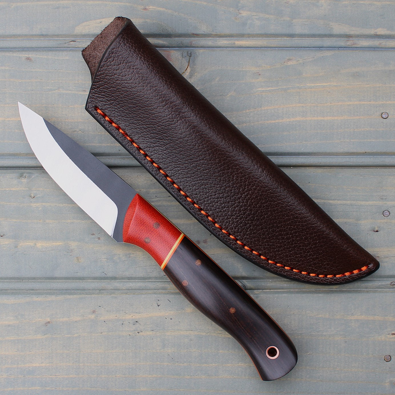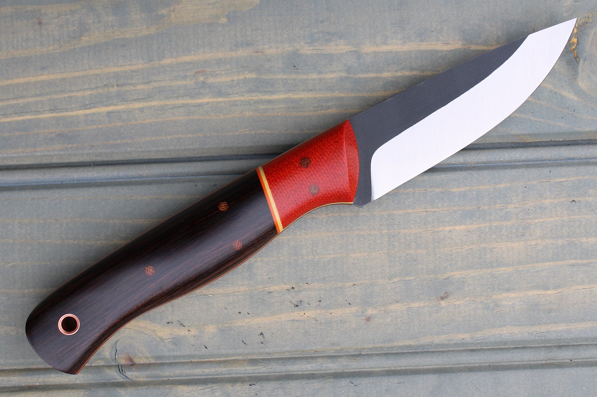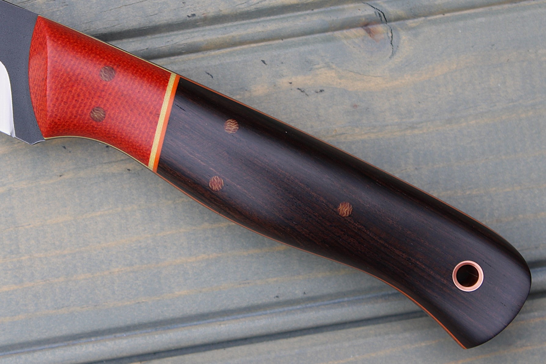 Handle: Chili Pepper Canvas Micarta Bolsters, African Blackwood Backs, Natural Canvas Micarta Liner, Orange & Yellow G10 Pinstripe, Micarta Pins