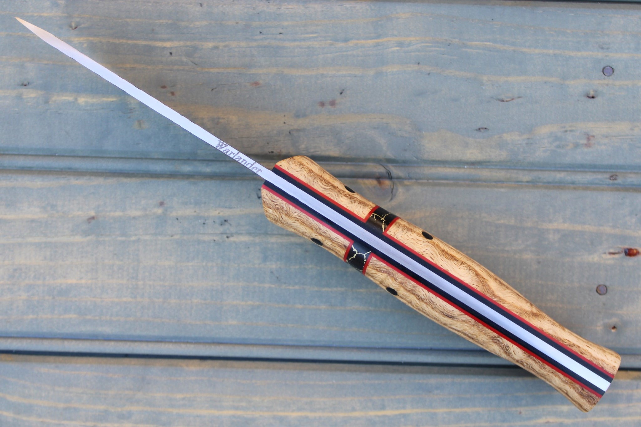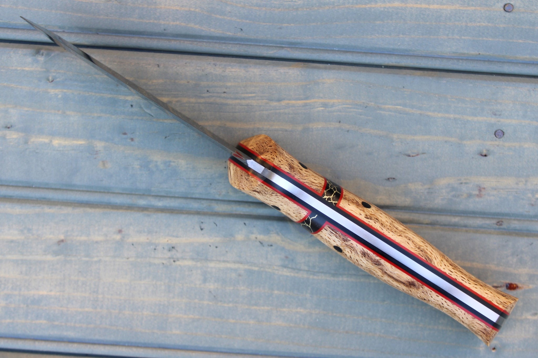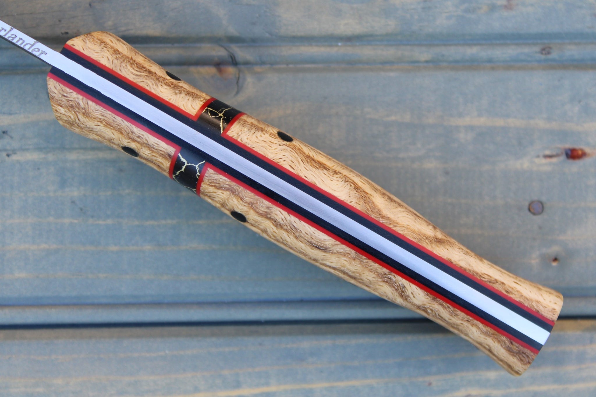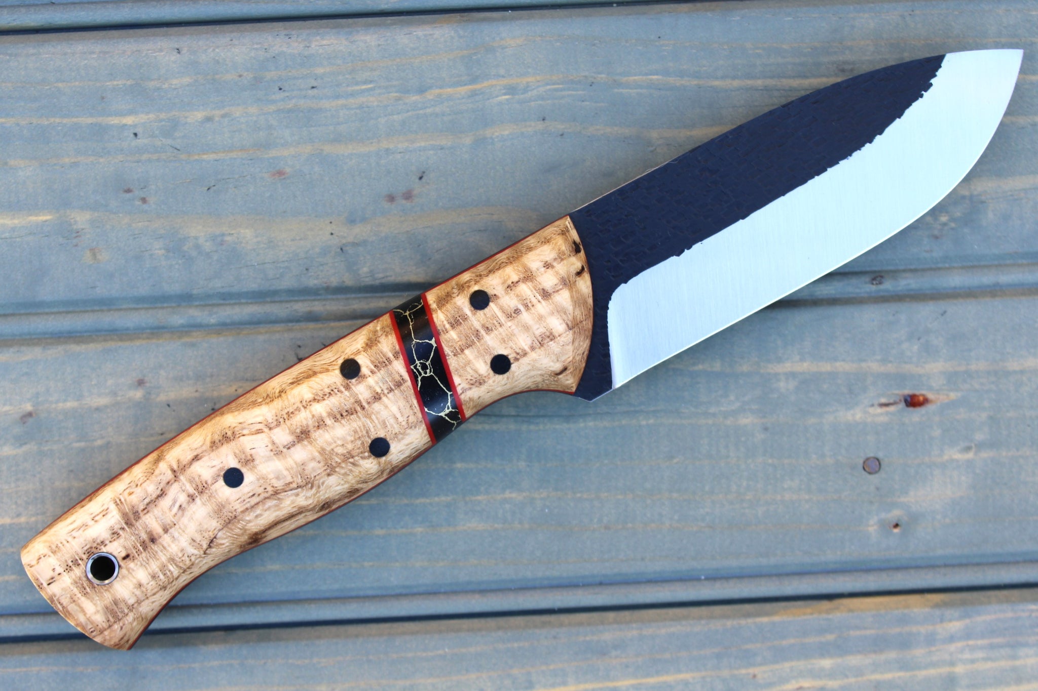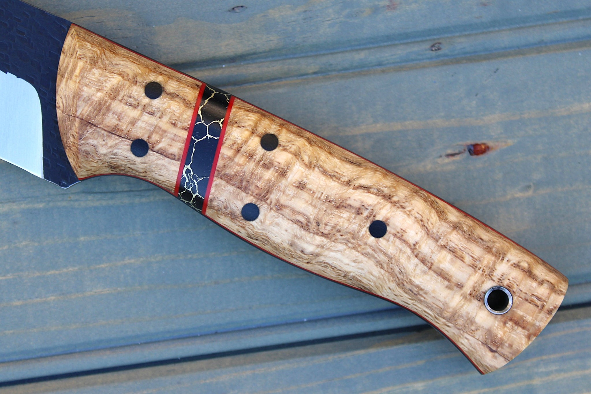 Handle: Natural Stabilized Curly Oak, Black Micarta Liner, Red G10 Pinstripe, Silestone (Black/Gold) Spacer, Black Micarta Pins
