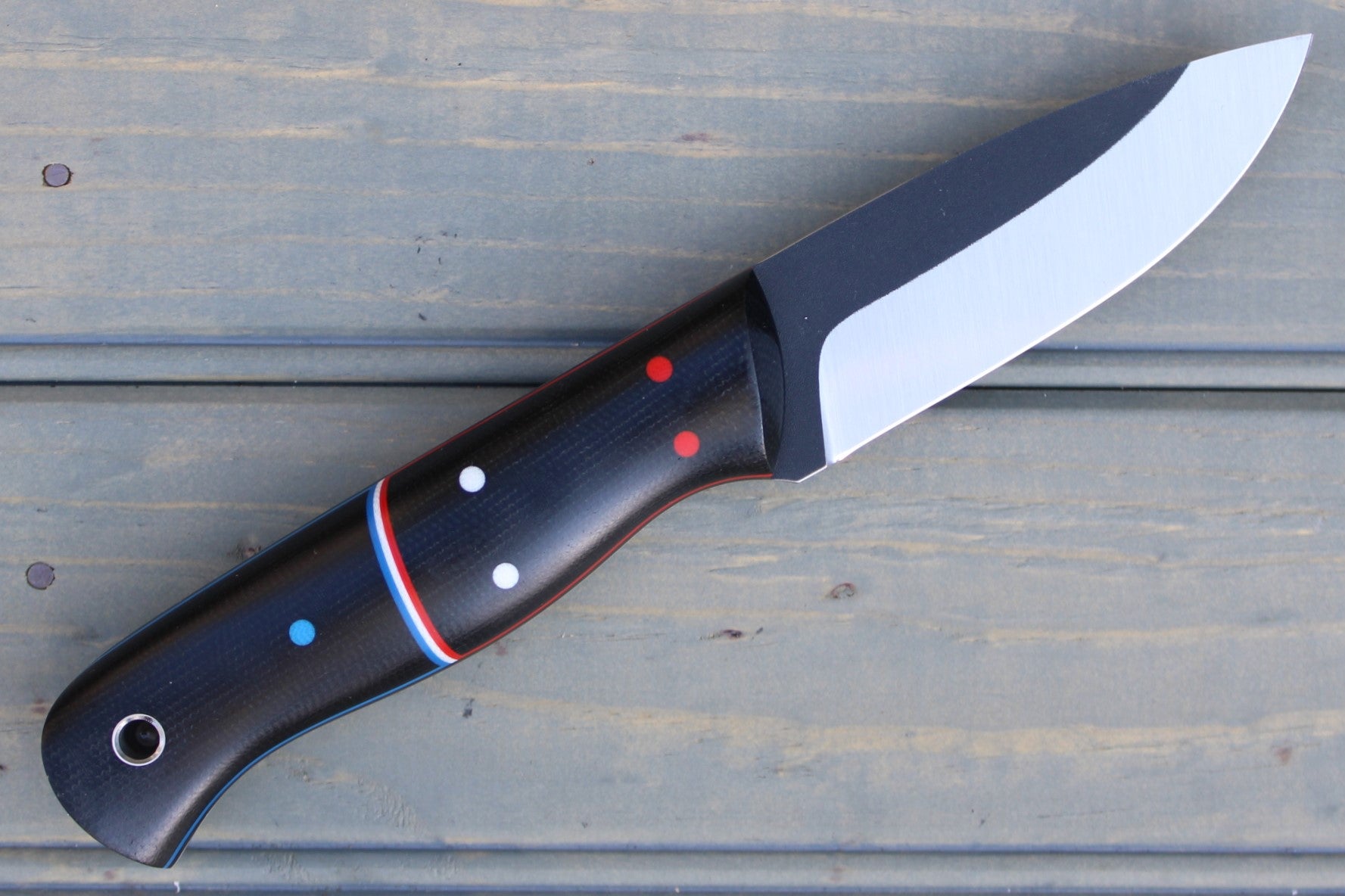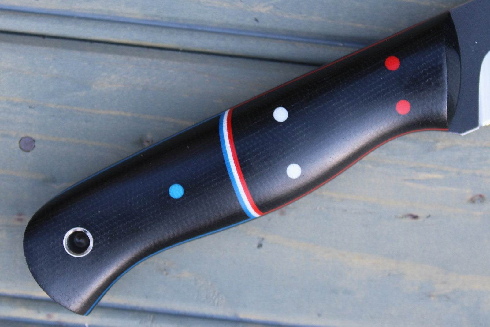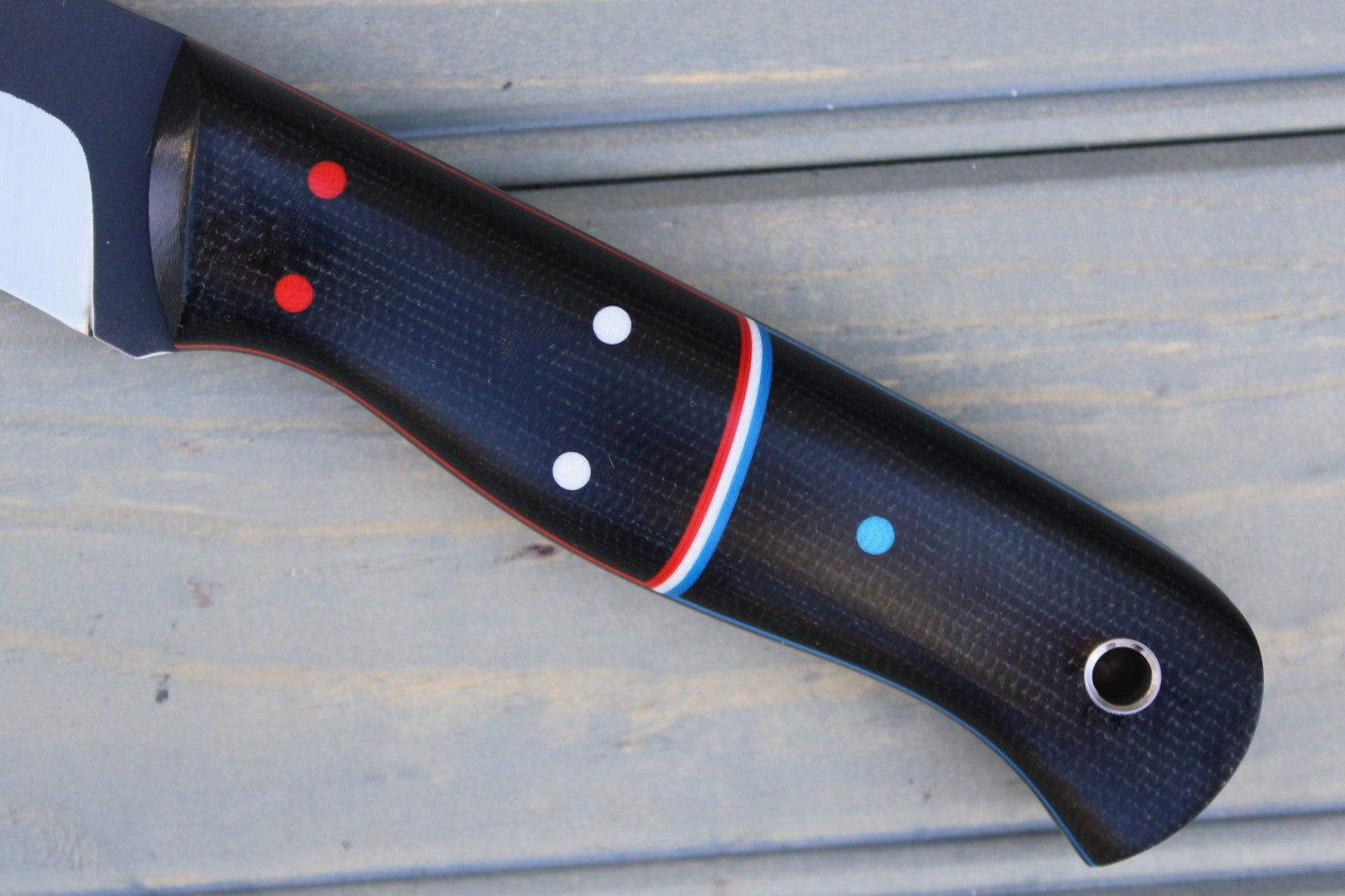 Handle: Black Canvas Micarta Bolsters & Backs, Black Canvas Micarta Liner, Red, White & Blue G10 Pinstripe and Pins