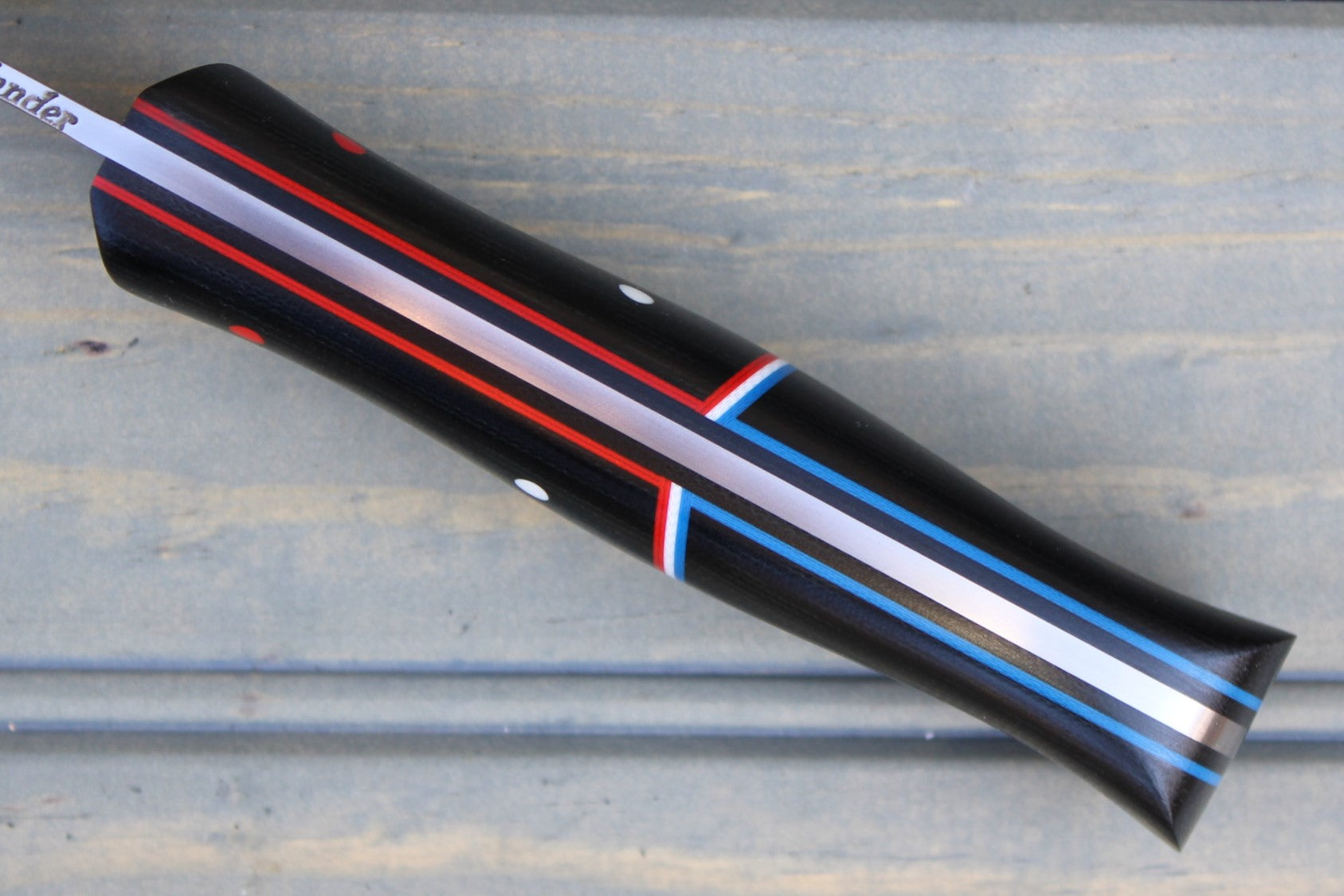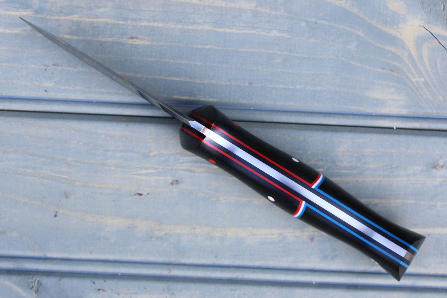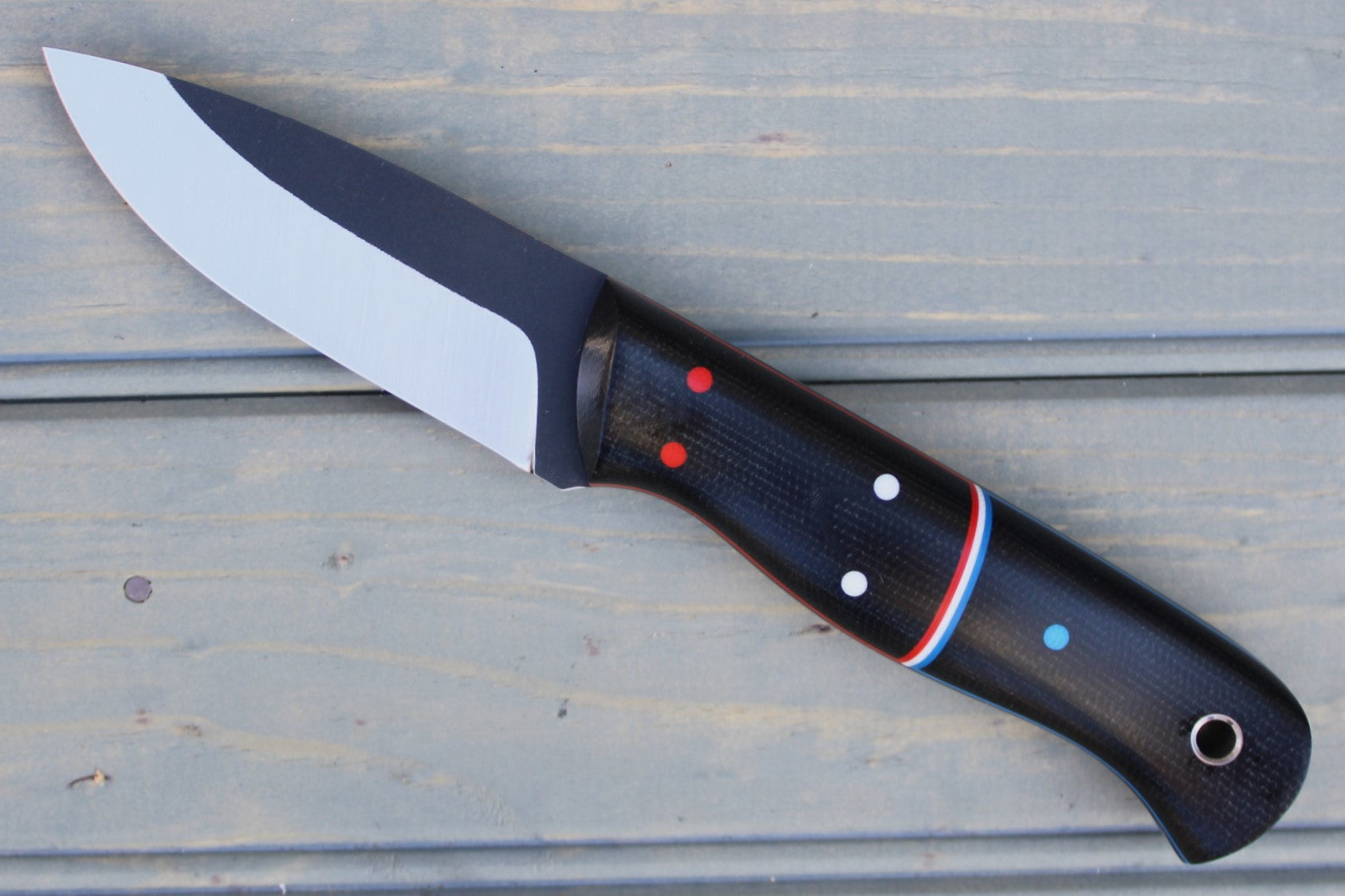 Handle: Black Canvas Micarta Bolsters & Backs, Black Canvas Micarta Liner, Red, White & Blue G10 Pinstripe and Pins