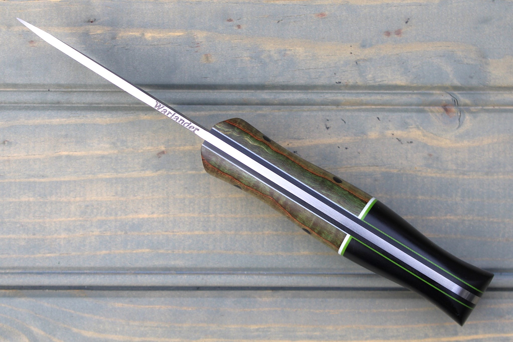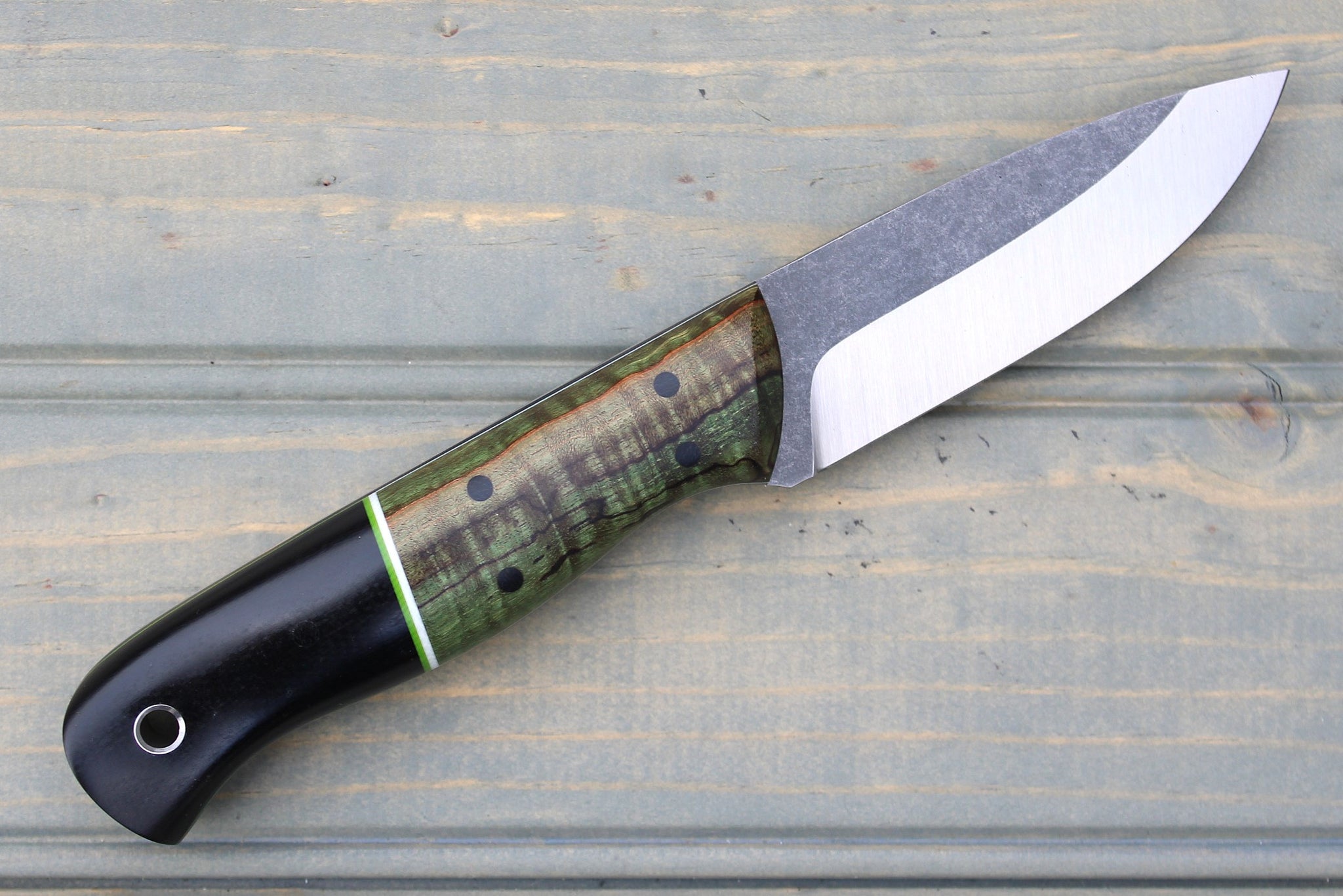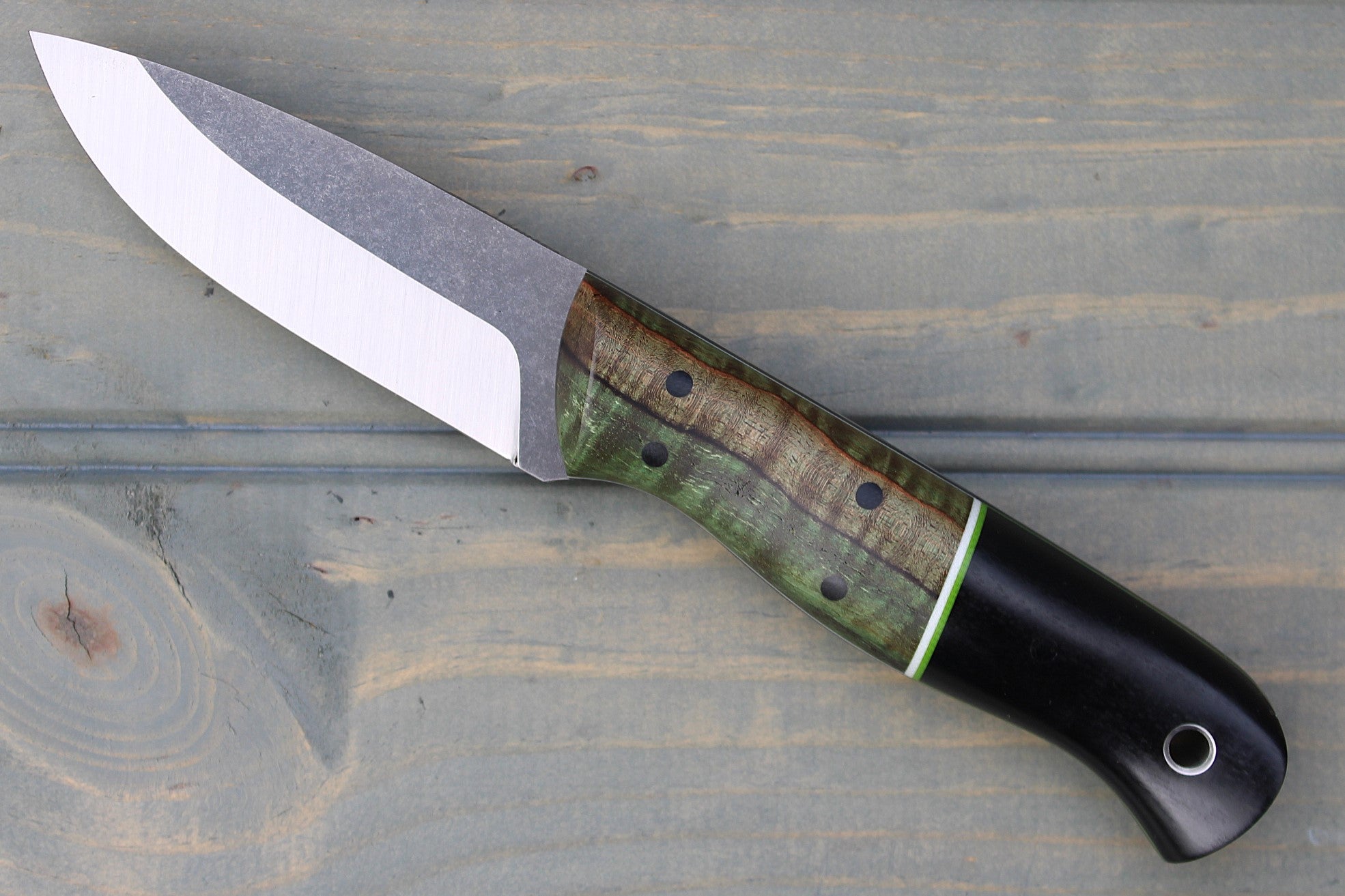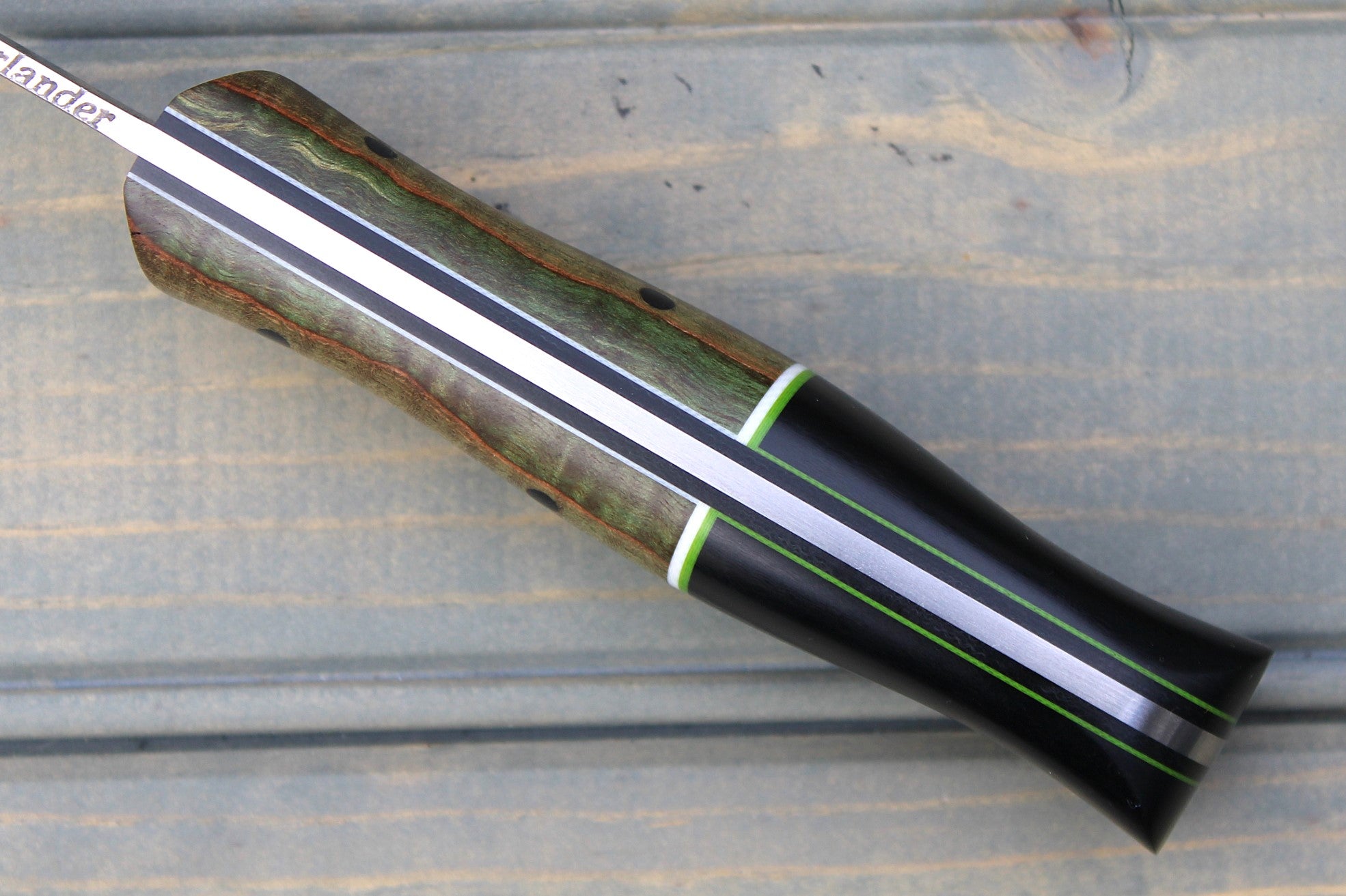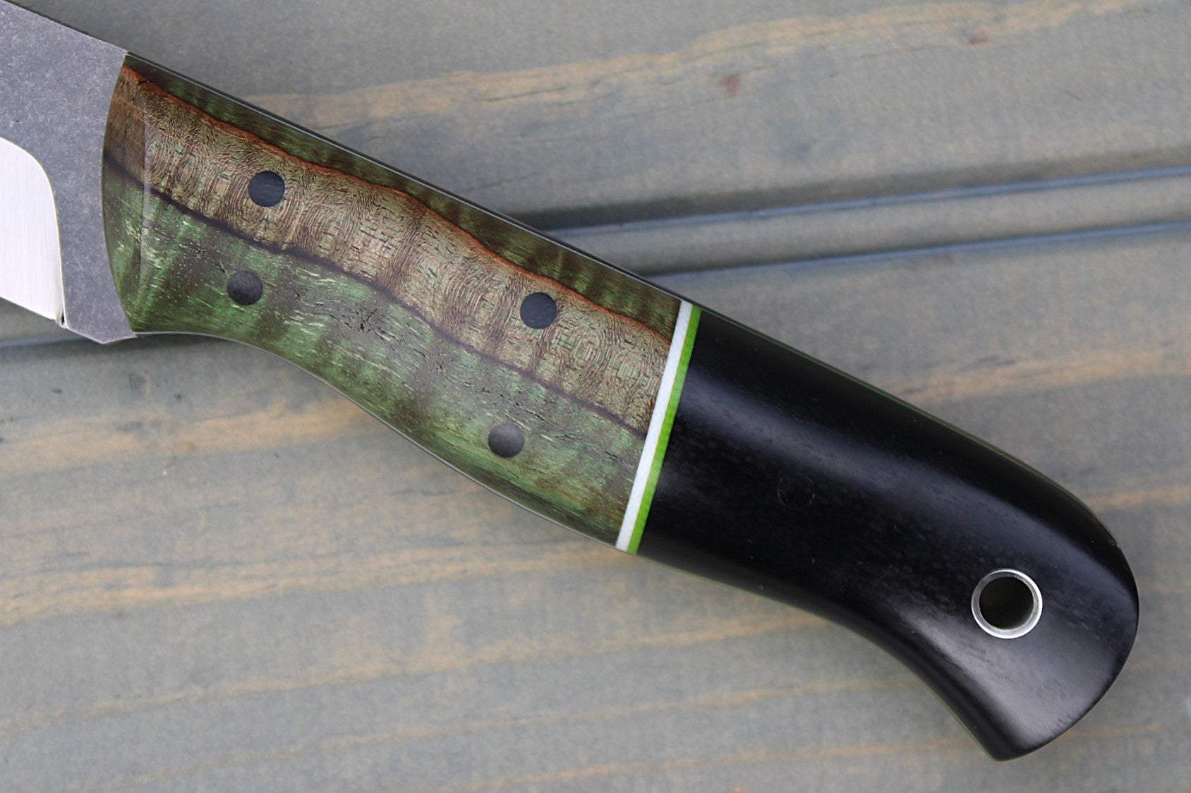 Handle: Spalted Curly Emerald Maple Bolsters, Black G10 Backs, Black Canvas Micarta Liner, Lime and White G10 Pinstripe, Black Micarta Pins