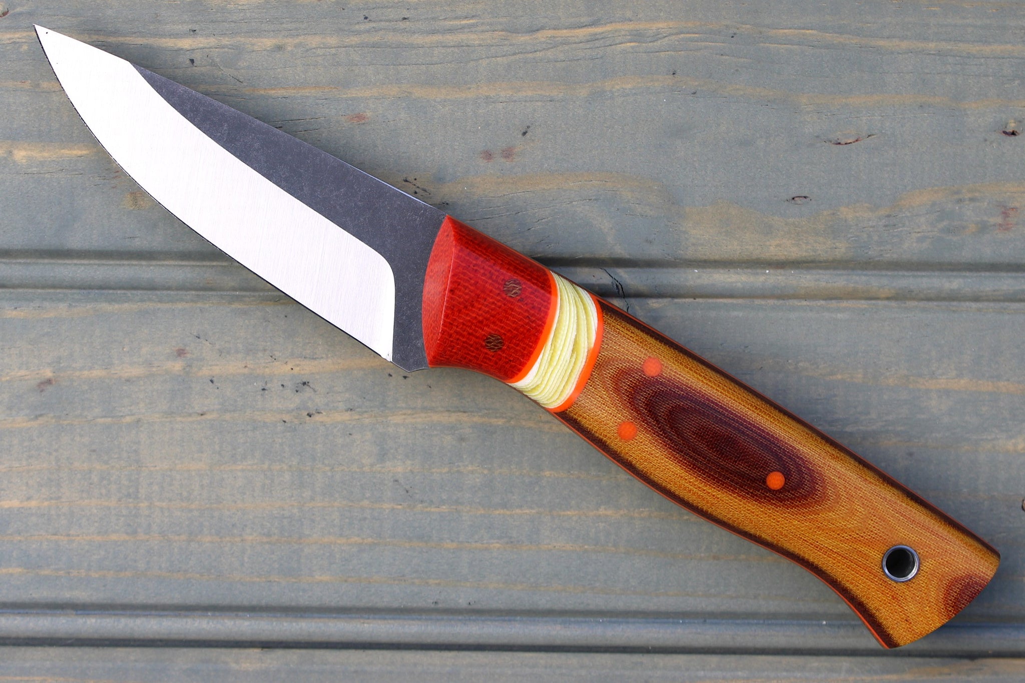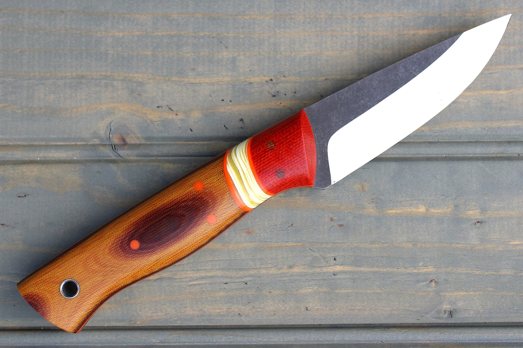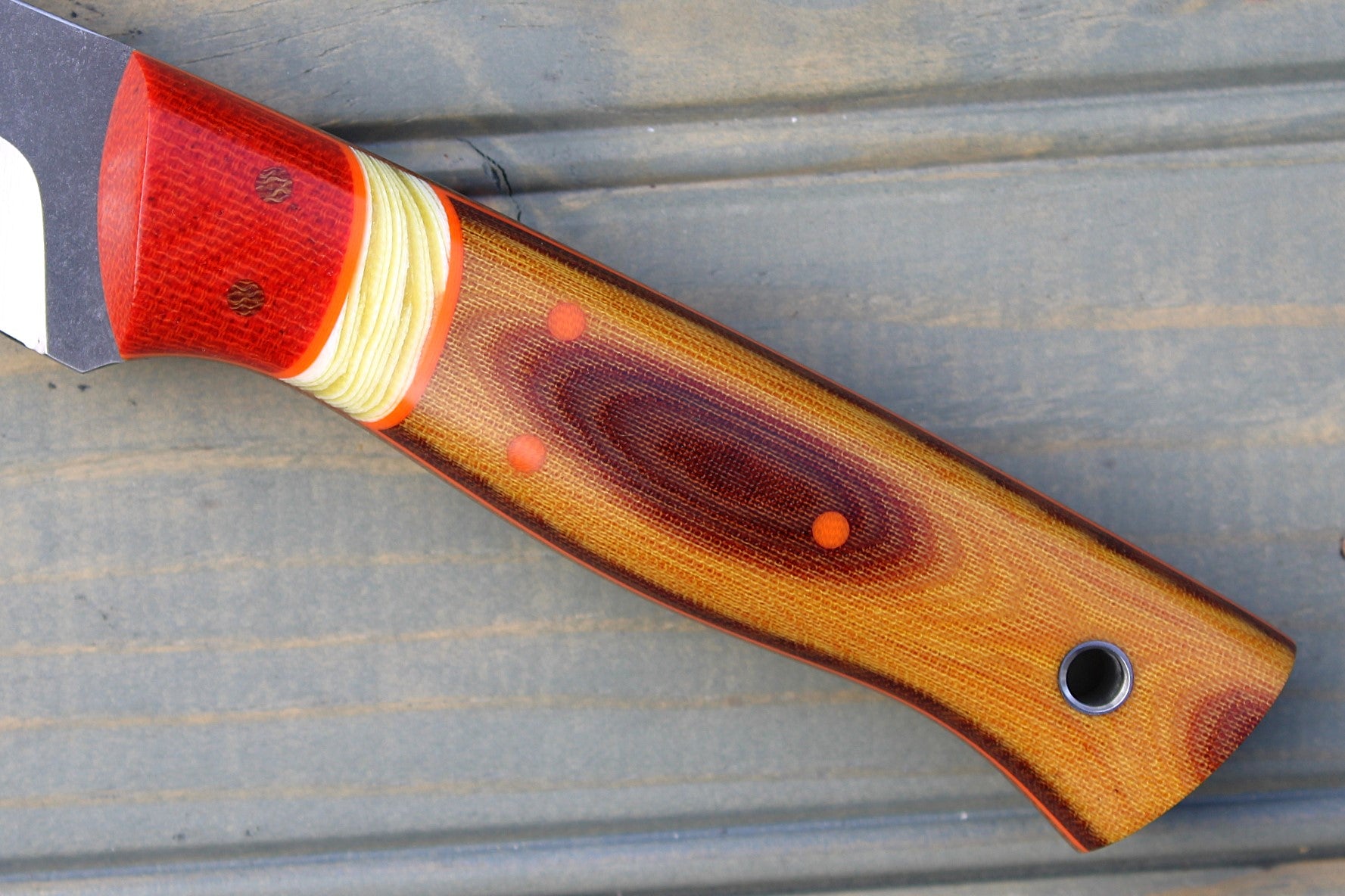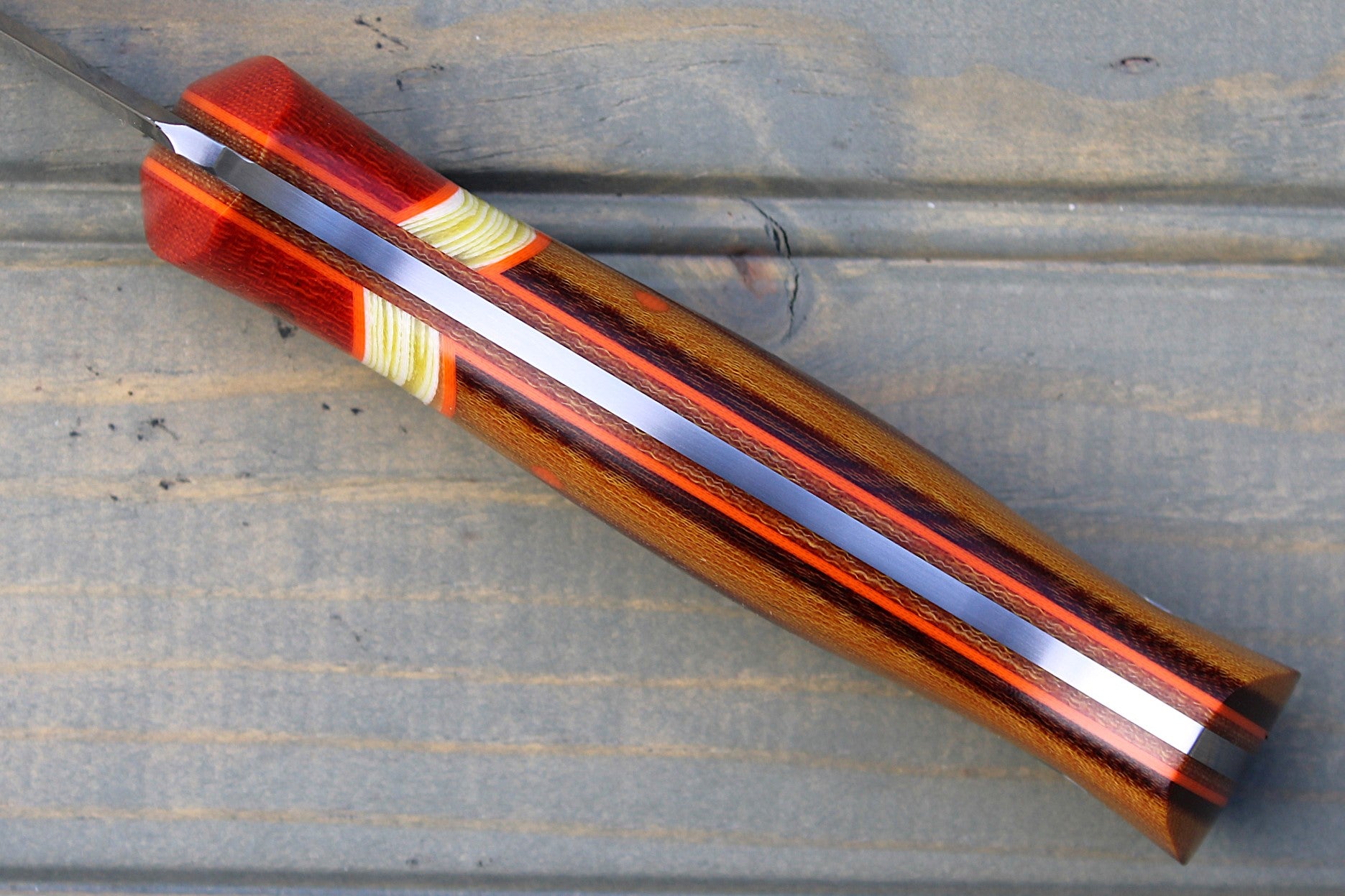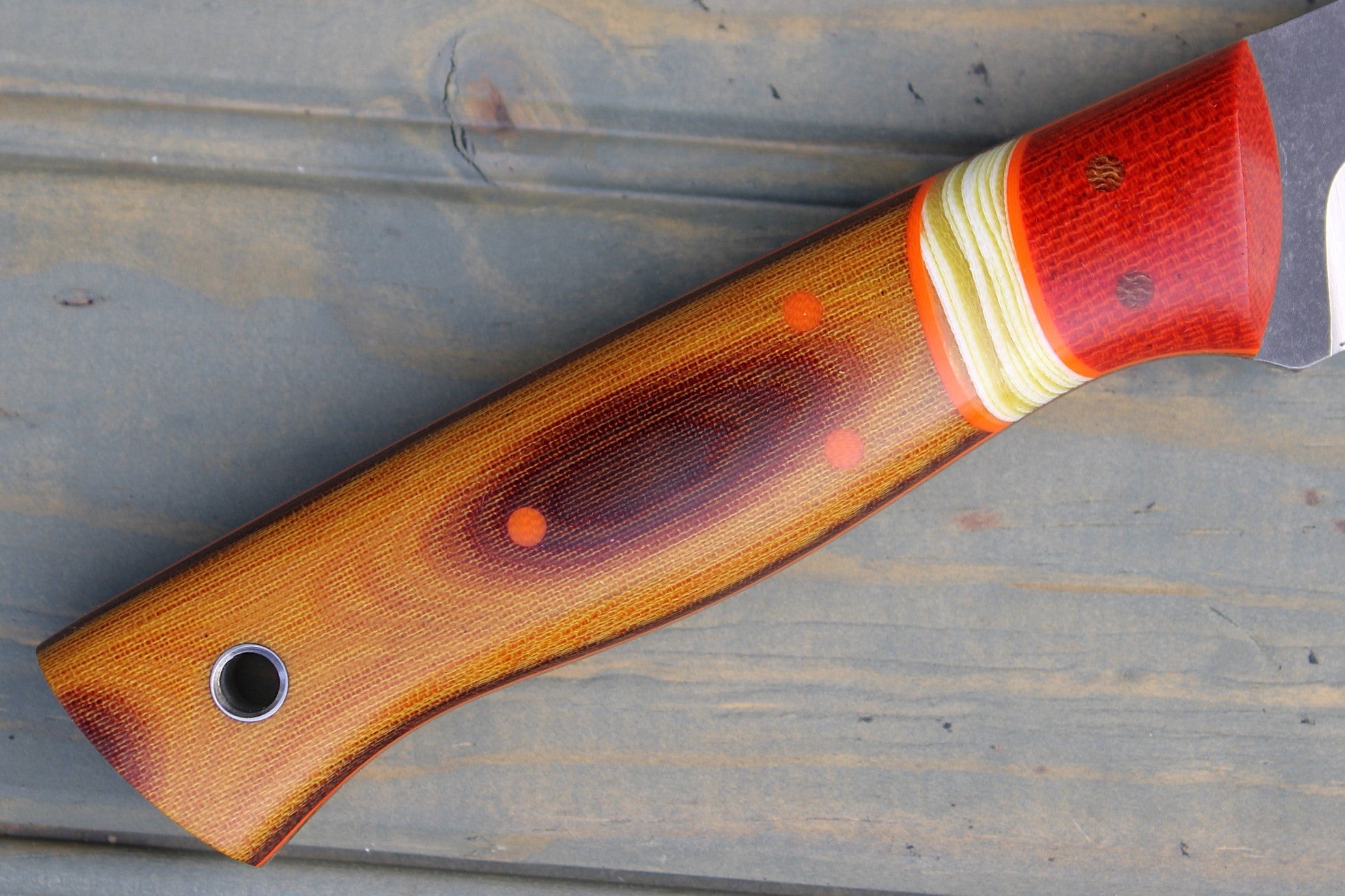 Handle: Chili Pepper Canvas Micarta Bolsters, Vintage Linen Micarta Backs, Banana Cream G10 Spacer, Orange G10 Pinstripe, Natural Canvas Micarta Liner
