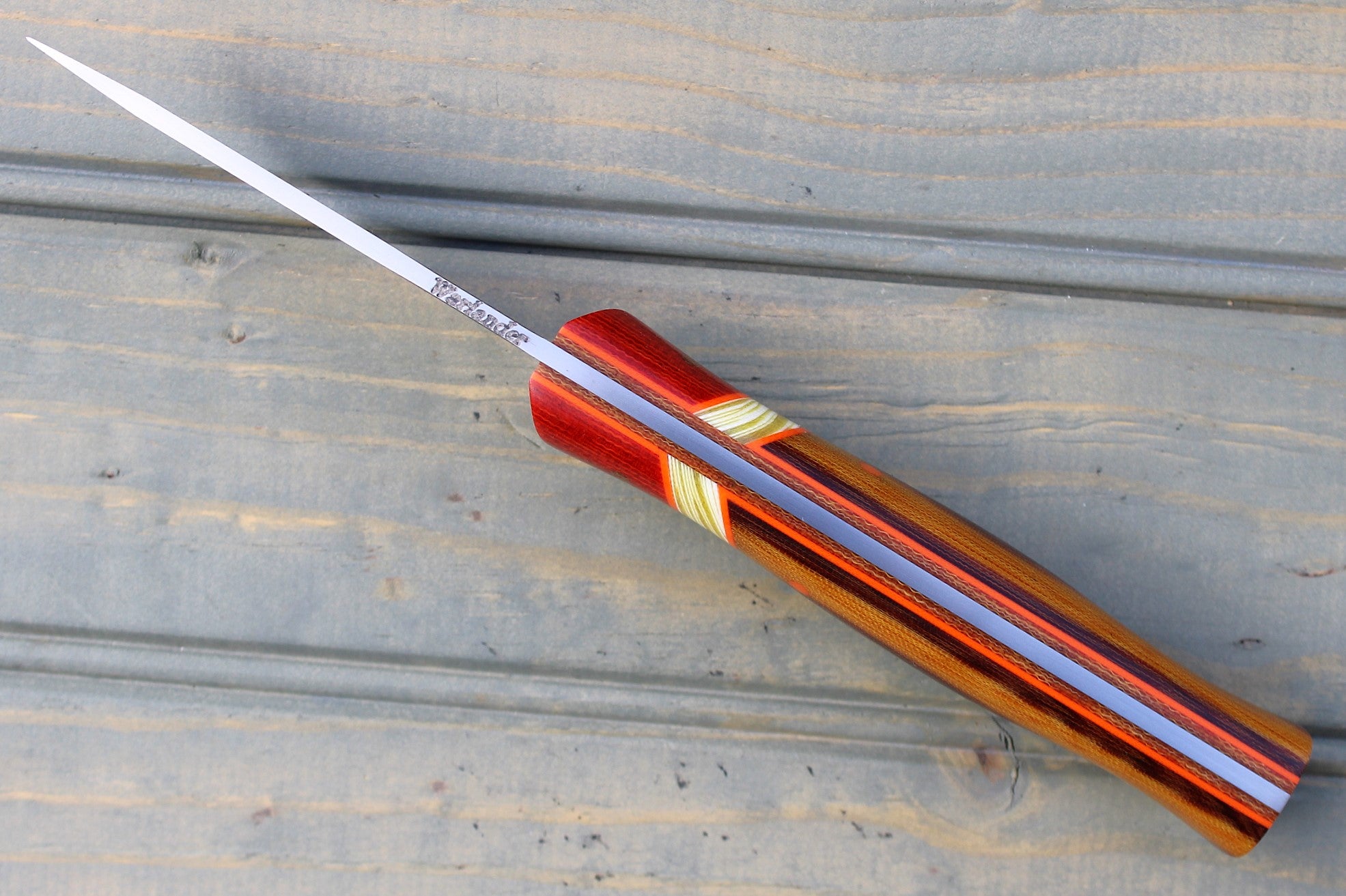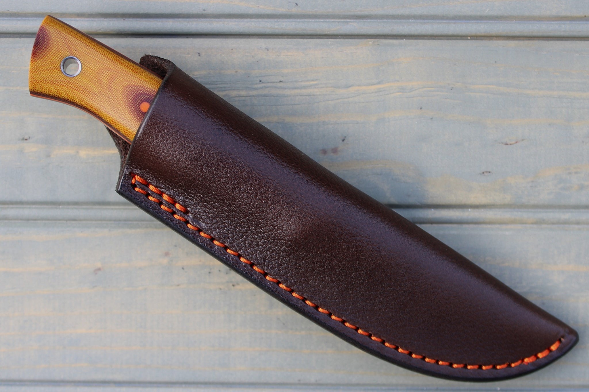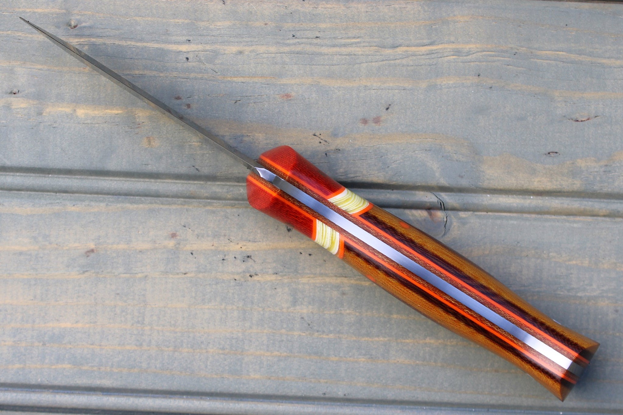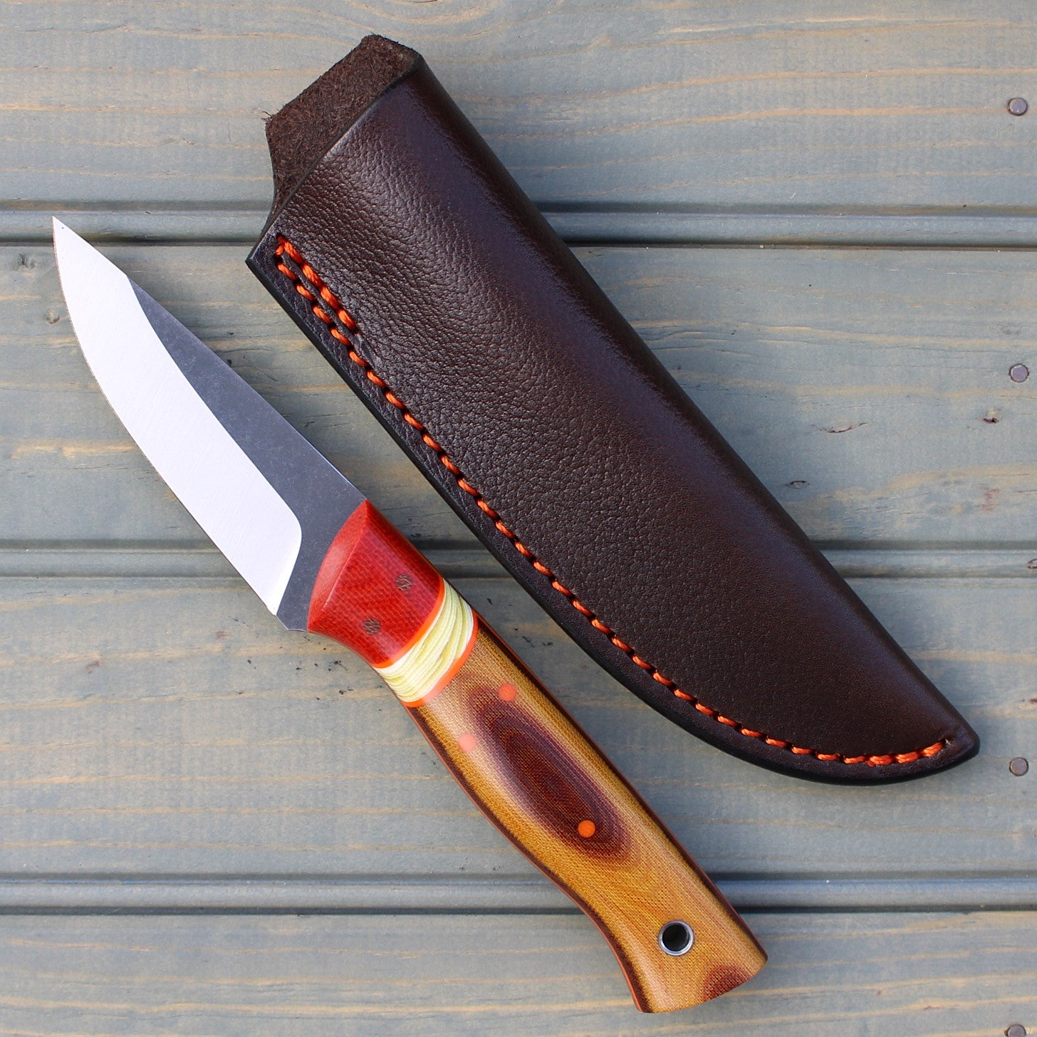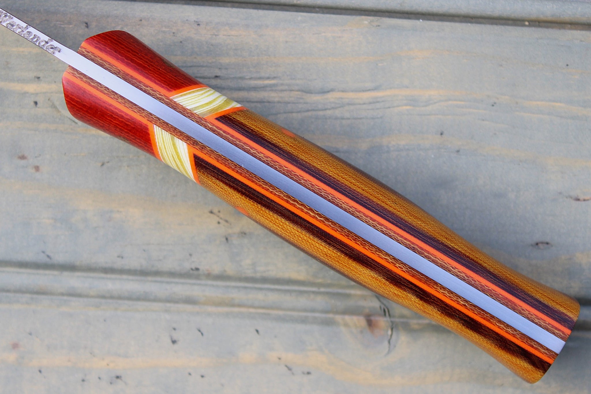 Handle: Chili Pepper Canvas Micarta Bolsters, Vintage Linen Micarta Backs, Banana Cream G10 Spacer, Orange G10 Pinstripe, Natural Canvas Micarta Liner