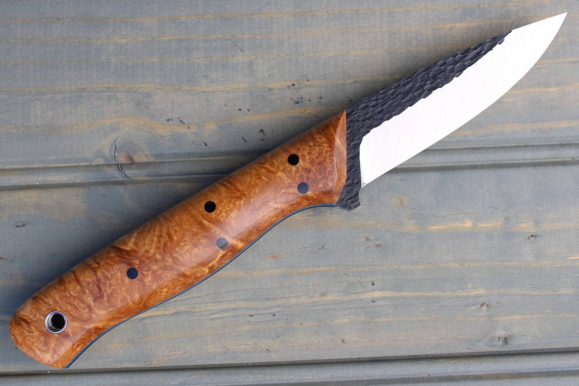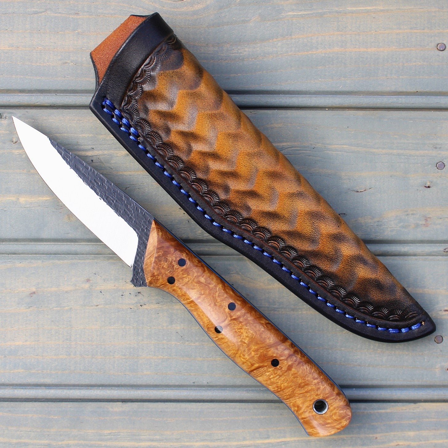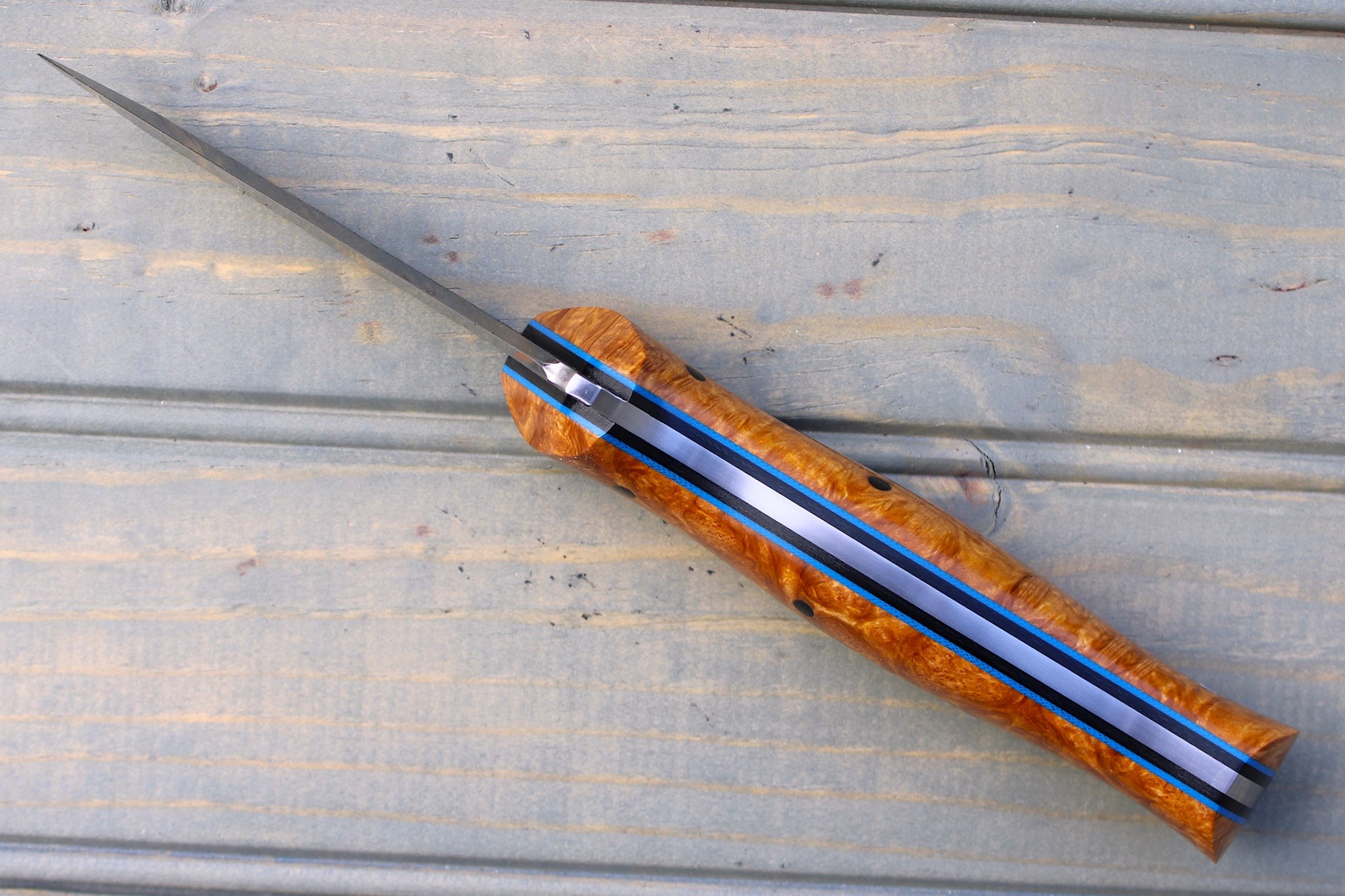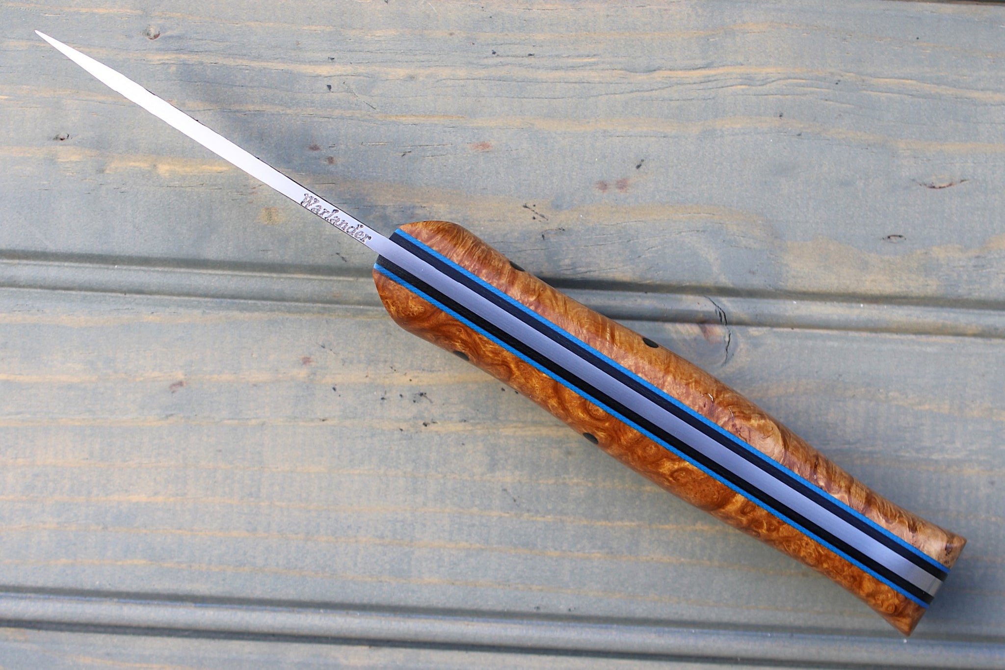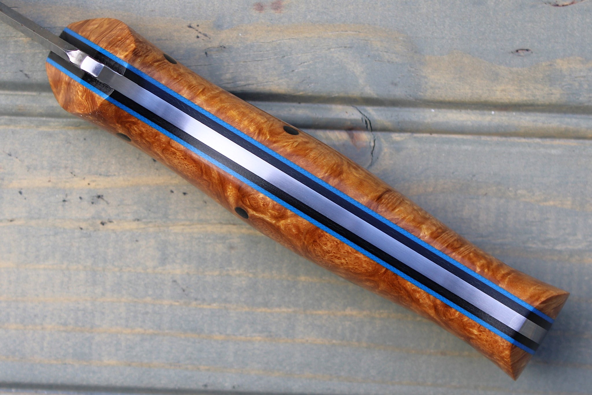 Handle: Natural Amboyna Burl, Black Canvas Micarta Liner, Blue G10 Pinstripe, Micarta Pins