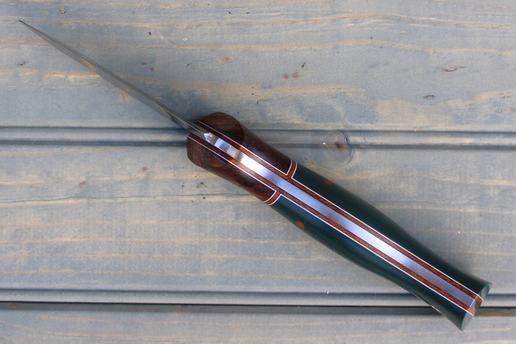 Handle: Turkish Walnut Bolsters, Forest Green G10 Backs, Natural Canvas Micarta Liner & Spacer, Thin White G10 Pinstripe, Micarta Pins